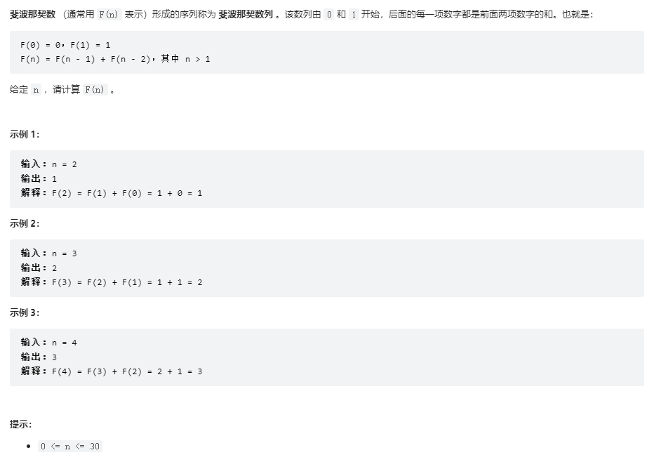 第一想到的应该就是递归,用递归尝试后爆溢栈了,于是便想到用一个数组记录下来已算出的斐波那契数。我犯的一个低级错误就是把 if (n == 1 || n == 0) return n; 刚开始没有放到 fib 函数里,导致系统输入 0 时,直接 n - 1 = -1,数组越界报错了 🤣 长时间不思考果然脑袋就变笨了