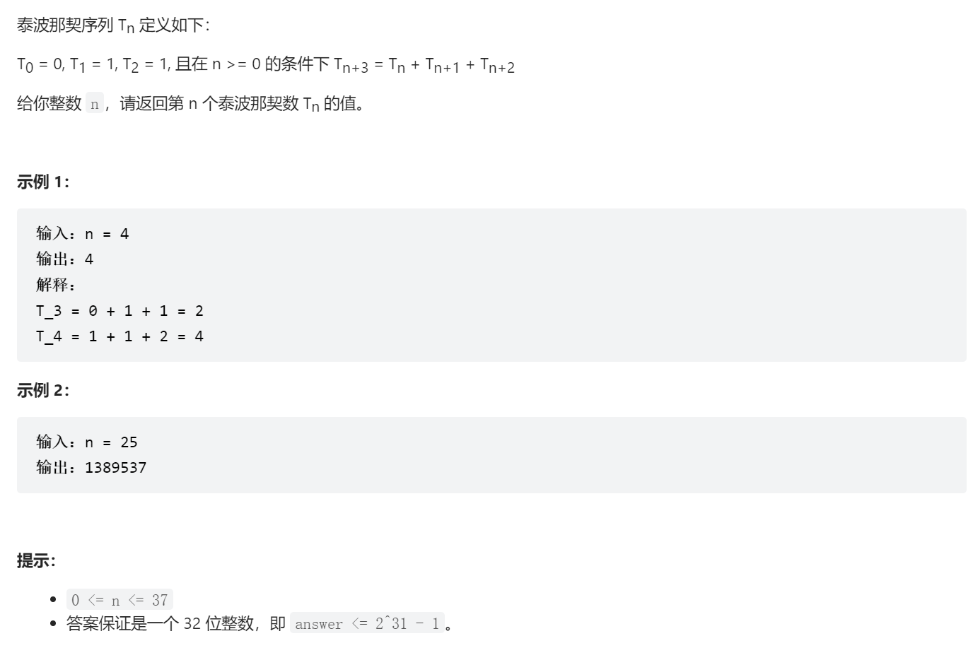 和昨天的斐波那契数思路一样,用滚动数组的思想,关键点在于设置 p、q、t、r 的初值,我们知道,r = p + q + t,第一个要计算的值是 Fn (3),T_3 = 0 + 1 + 1,这是滚动之后的,所以 p、q、t、r 的初值应该是 0、0、1、1,这样滚动过后才能变成 0、1、1,就能算出 Fn (3) = r = 0 + 1 + 1。Easy~