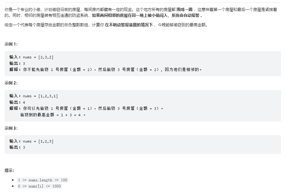 这道题看起来不难,不就在上一道题的基础上添加了首尾房间相邻的限制吗,但我尝试解了三次都失败了,太丢人了 🤣