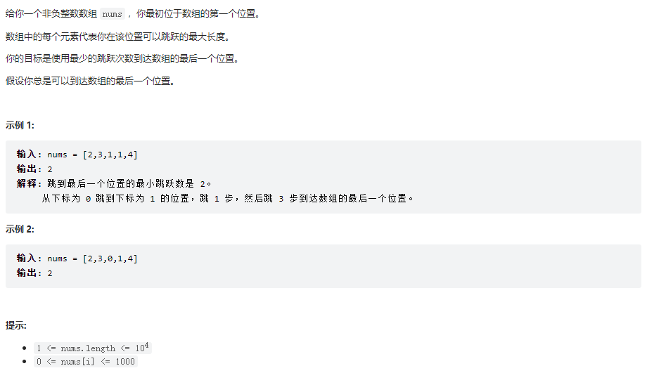 上一题我们可以知道在当前 i 处能走到的最大距离,所以稍微一思考,只要后面走的距离在这最大距离之内,步数都不变;只有能走的最大距离不能满足 i 了,才把步数加一,同时更新 i 处能走到的最大距离,是不是很 easy~