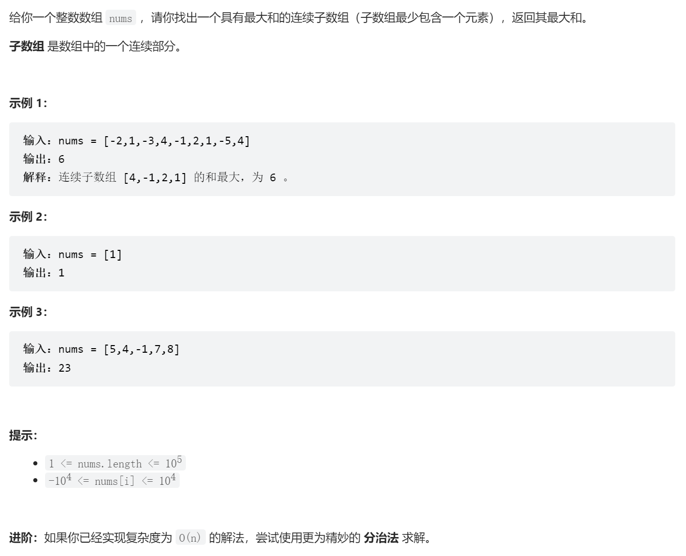但言归正传,看了官方题解后,发现我就真是没转过那个弯来,你就管他是不是一个小负数会把更大的数组隔开,反正只要判断当前数的前面,前面数组的连续和是否对该数有帮助不就行了,有帮助我就收为我有(nums [i] + prev),没有帮助我就另起炉灶(nums [i]),然后再判断我另起炉灶的数和已知的最大和谁大,不断更新最大和就行了,啊啊啊啊,我真是笨呐,为什么这个弯我就没有转过来,我需要老婆的安慰呜呜呜~
