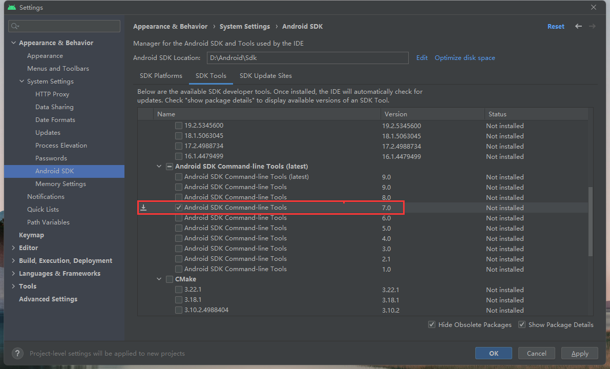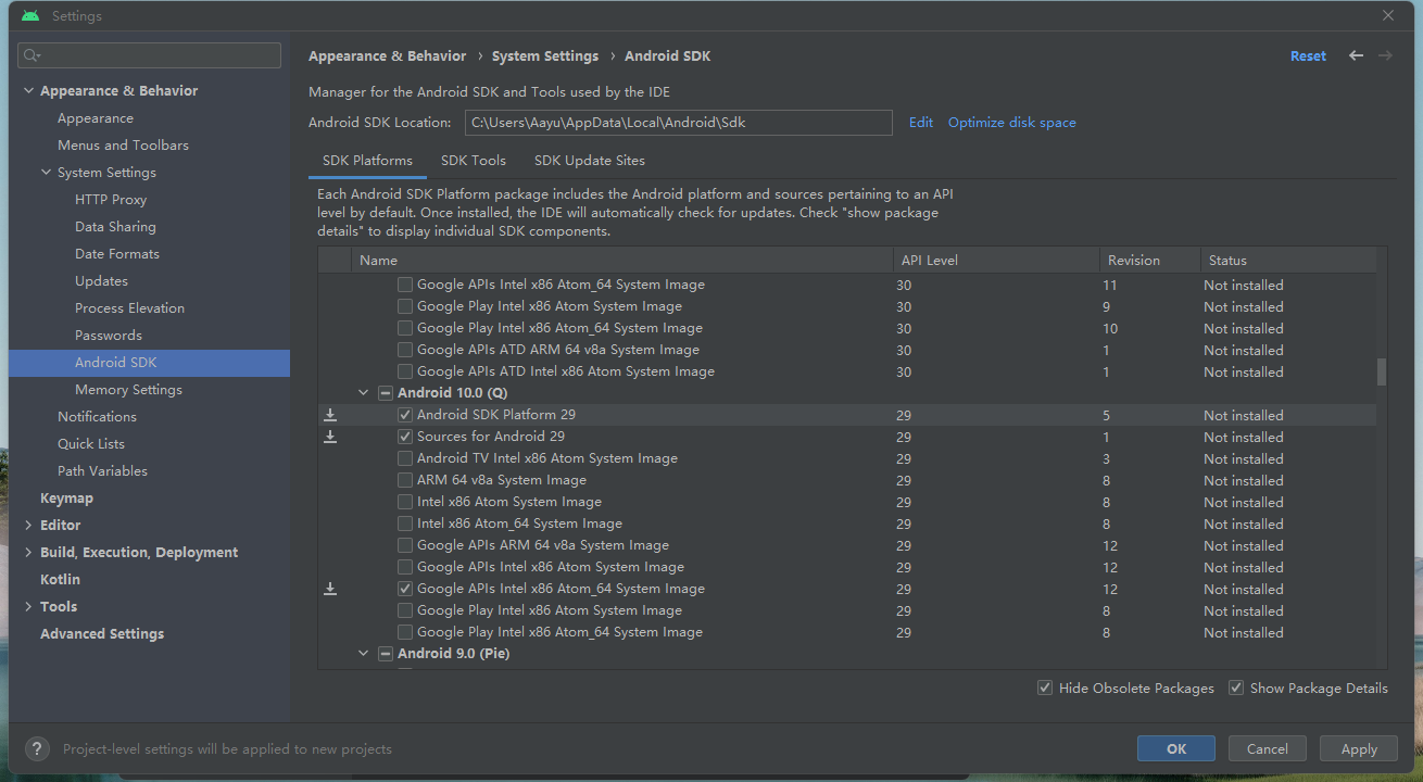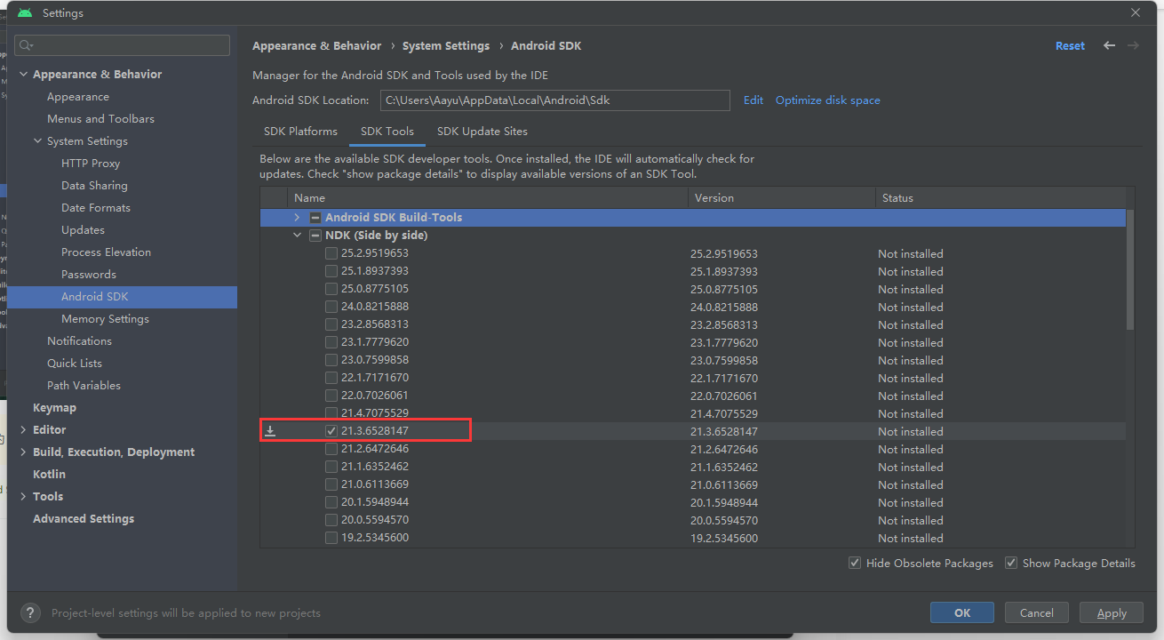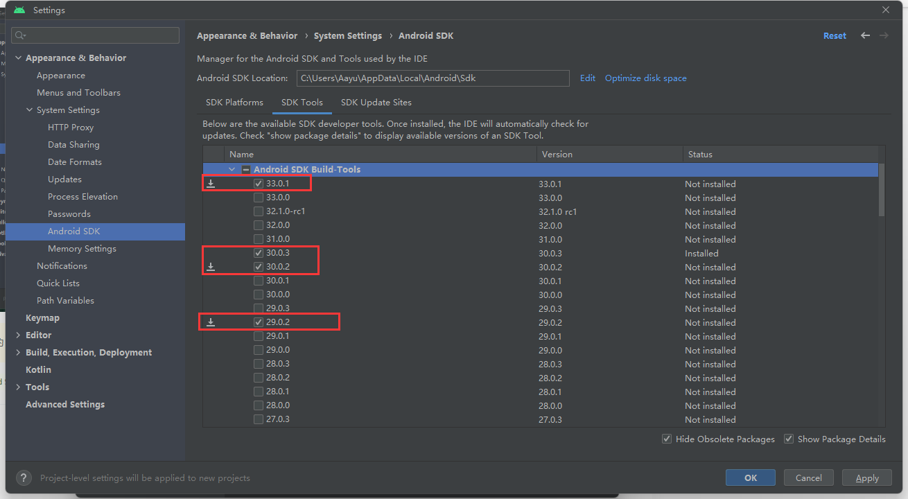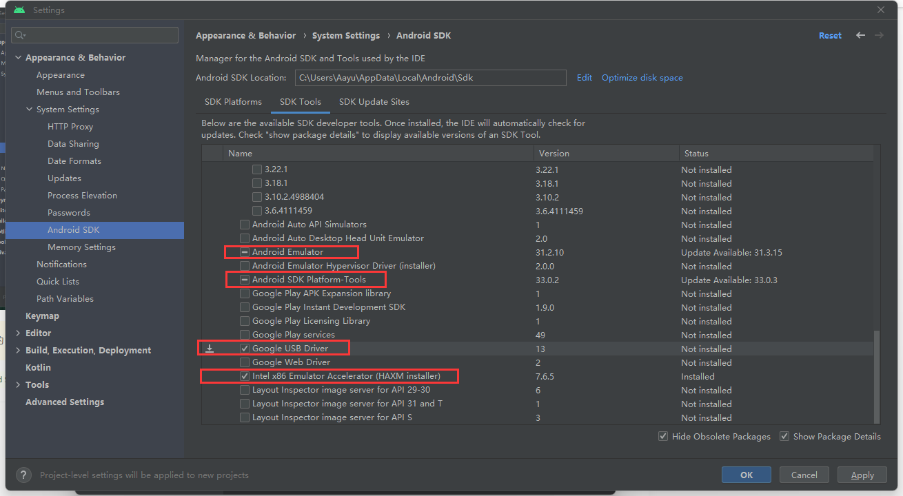 注意,默认安装的 Android SDK(例如 Android SDK Platform 33)不能删除,否则可能会有未知 Bug
