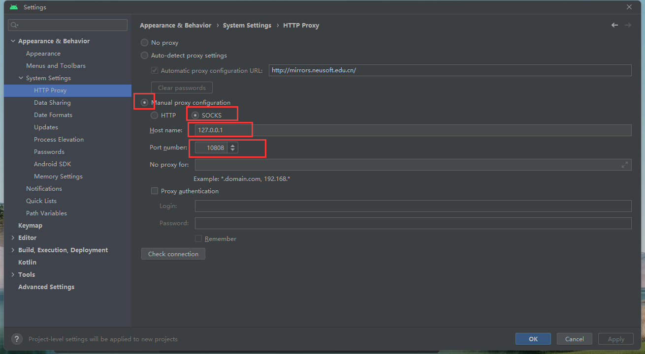 可以点击 Check connection 测试下 https://dl.google.com/android/repository/repository2-3.xml 能否访问成功,可以的话就表示代理没问题~