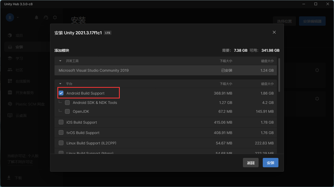 以安装 2021 最新稳定版为例,在 Unity Hub 上安装如下