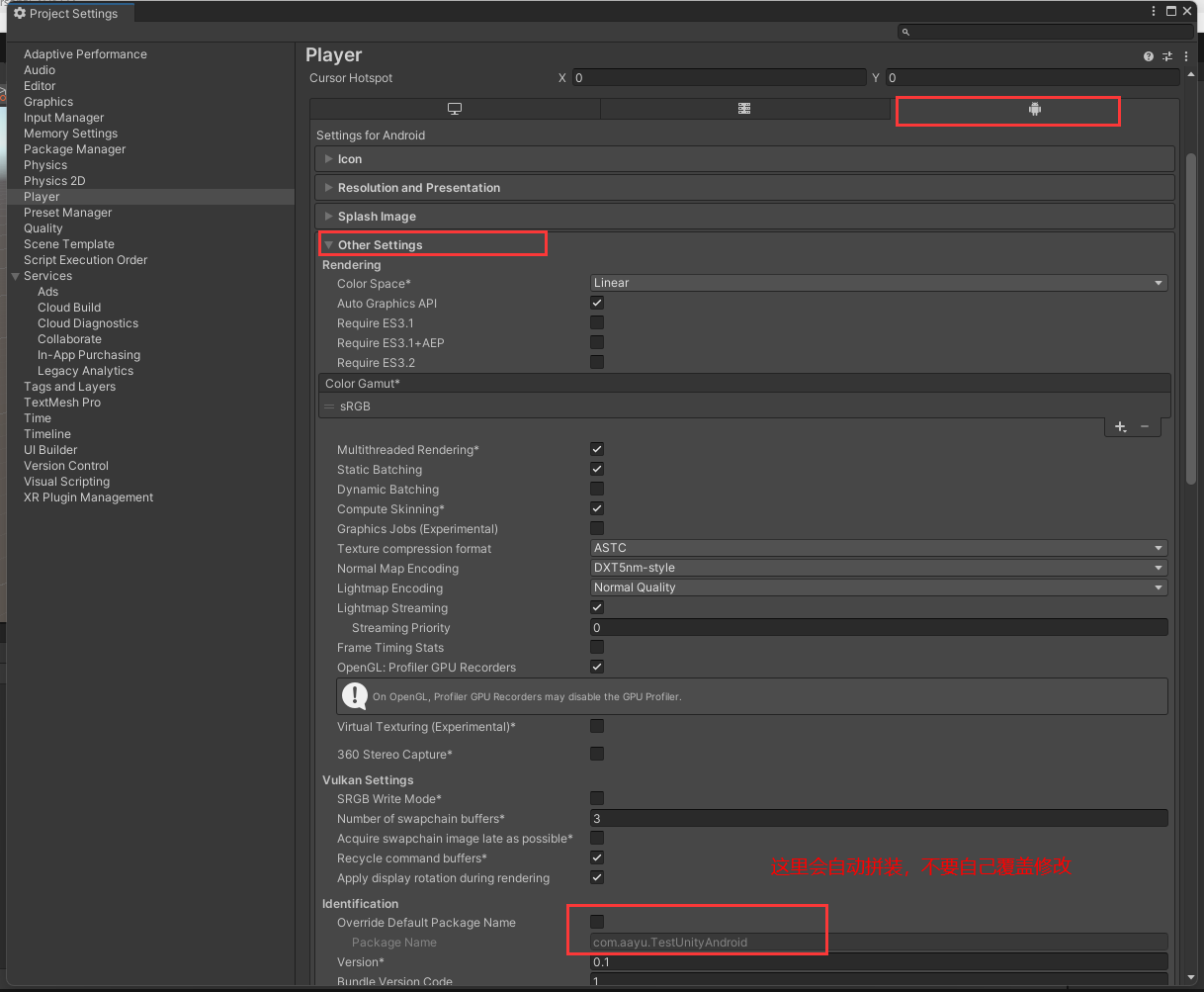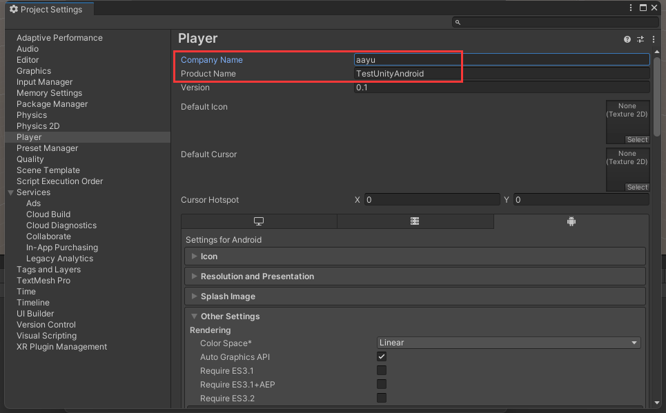 创建一个新项目,首先在「 File -> Build Settings -> Player Settings 」里设置下公司名和项目名,如下,unity 会自动组合成包名