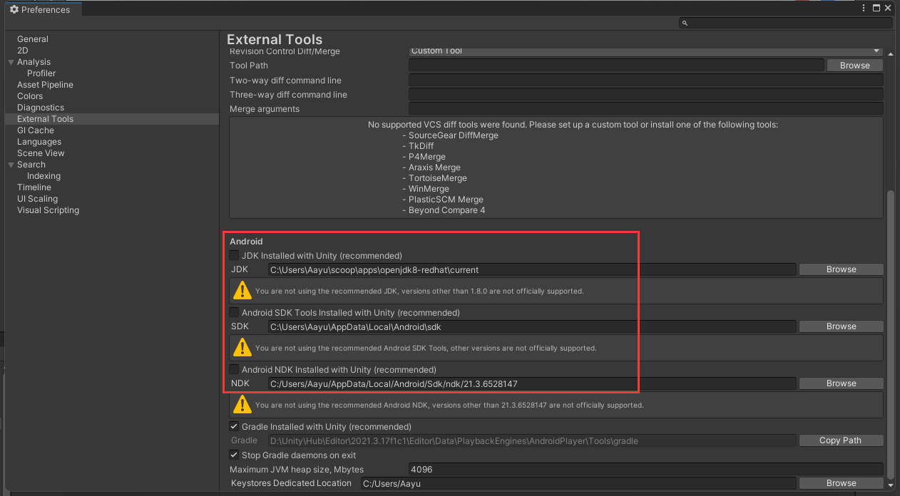 然后在「 Editor -> Preference 」里正确设置 JDK,Android SDK 和 NDK,然后打开下 Gradle 的路径,记住 Unity 的 Gradle 的版本是多少,后面 Android Studio 联调时,需要和 Unity 保持一致