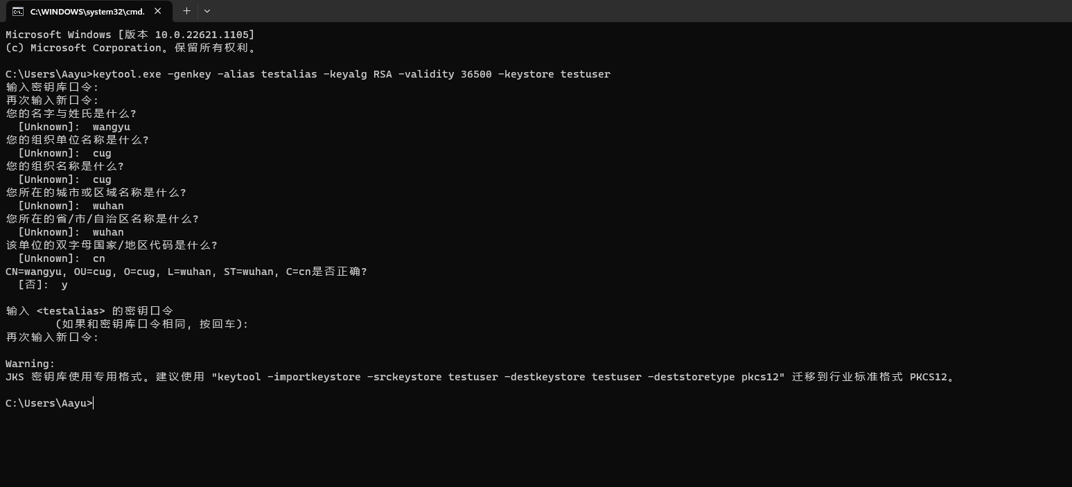 keytool -genkey -alias 密钥库名称 -keyalg RSA -validity 有效时间 -keystore 密钥库文件名 |