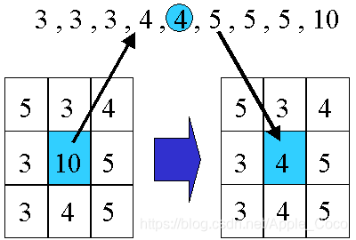 中值滤波本质上是统计排序滤波器(包括最小值滤波器和最大值滤波器)的一种,中值滤波对图像特定噪声类型(椒盐噪声)会取得比较好的去噪效果,也是常见的图像去噪声与增强的方法之一。中值滤波也是窗口在图像上移动,其覆盖的对应 ROI 区域下,所有像素值排序,取中值作为中心像素点的输出值。