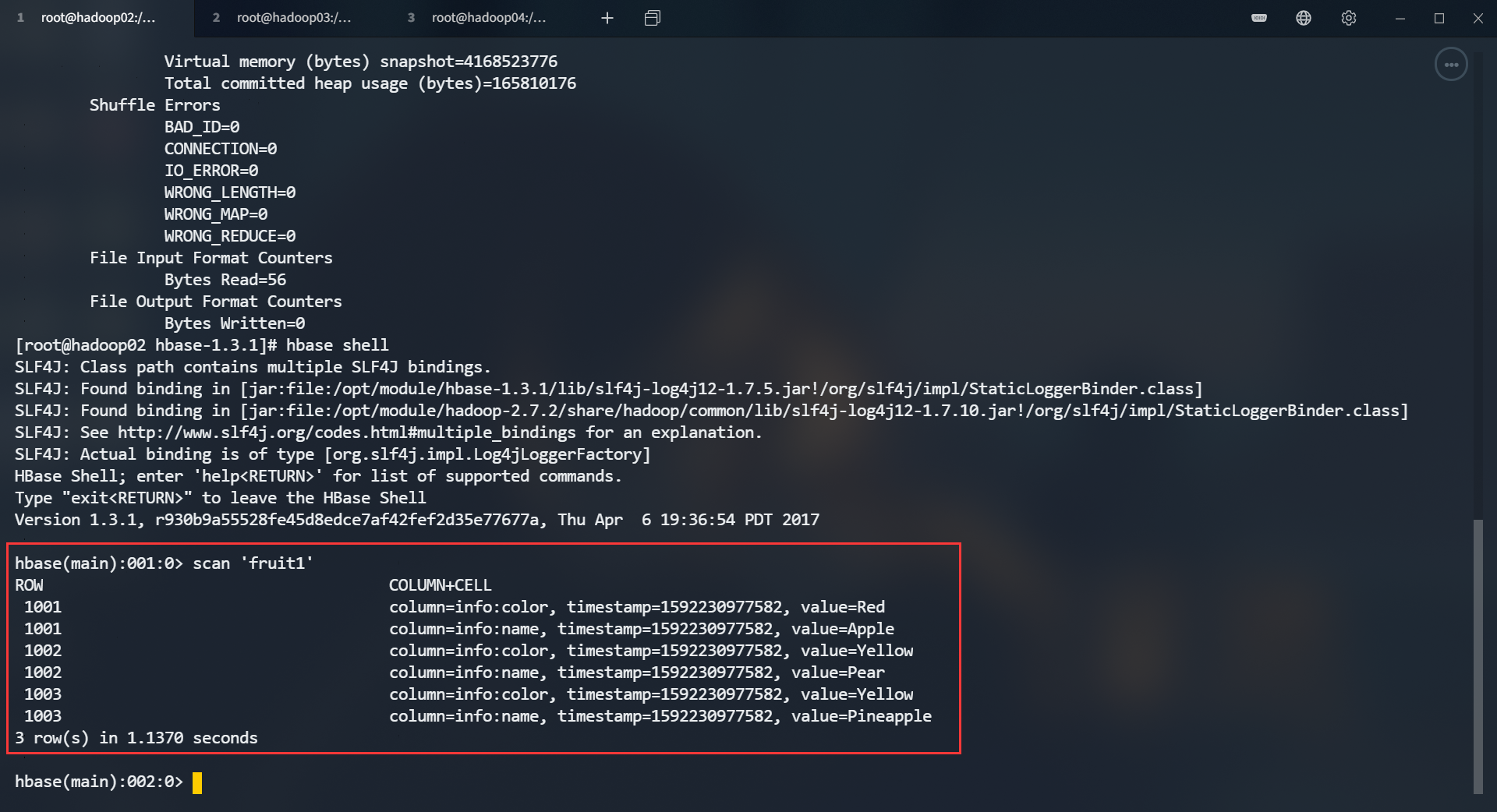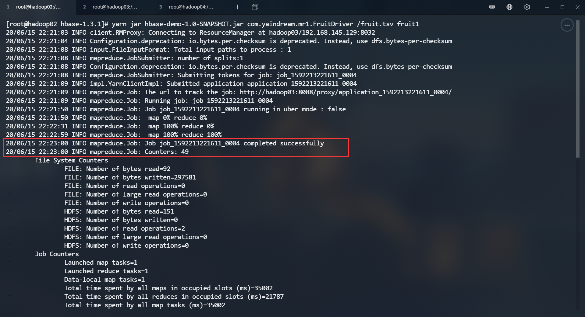 [root@hadoop02 hbase-1.3.1]# yarn jar hbase-demo-1.0-SNAPSHOT.jar com.yaindream.mr1.FruitDriver /fruit.tsv fruit1