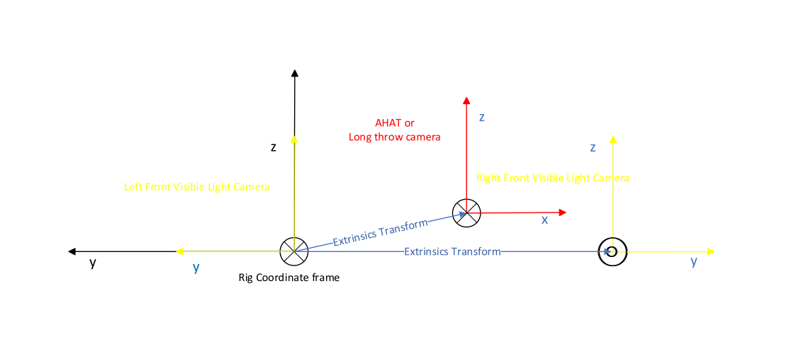每个传感器返回它的变换到 rigNode (Rig origin) 表示为一个外部刚体变换。图 1 显示了相机坐标帧相对于设备坐标帧。注意,在 HoloLens2 上,设备原点对应于左前方可见光相机。因此,该传感器返回的变换对应于恒等变换。
