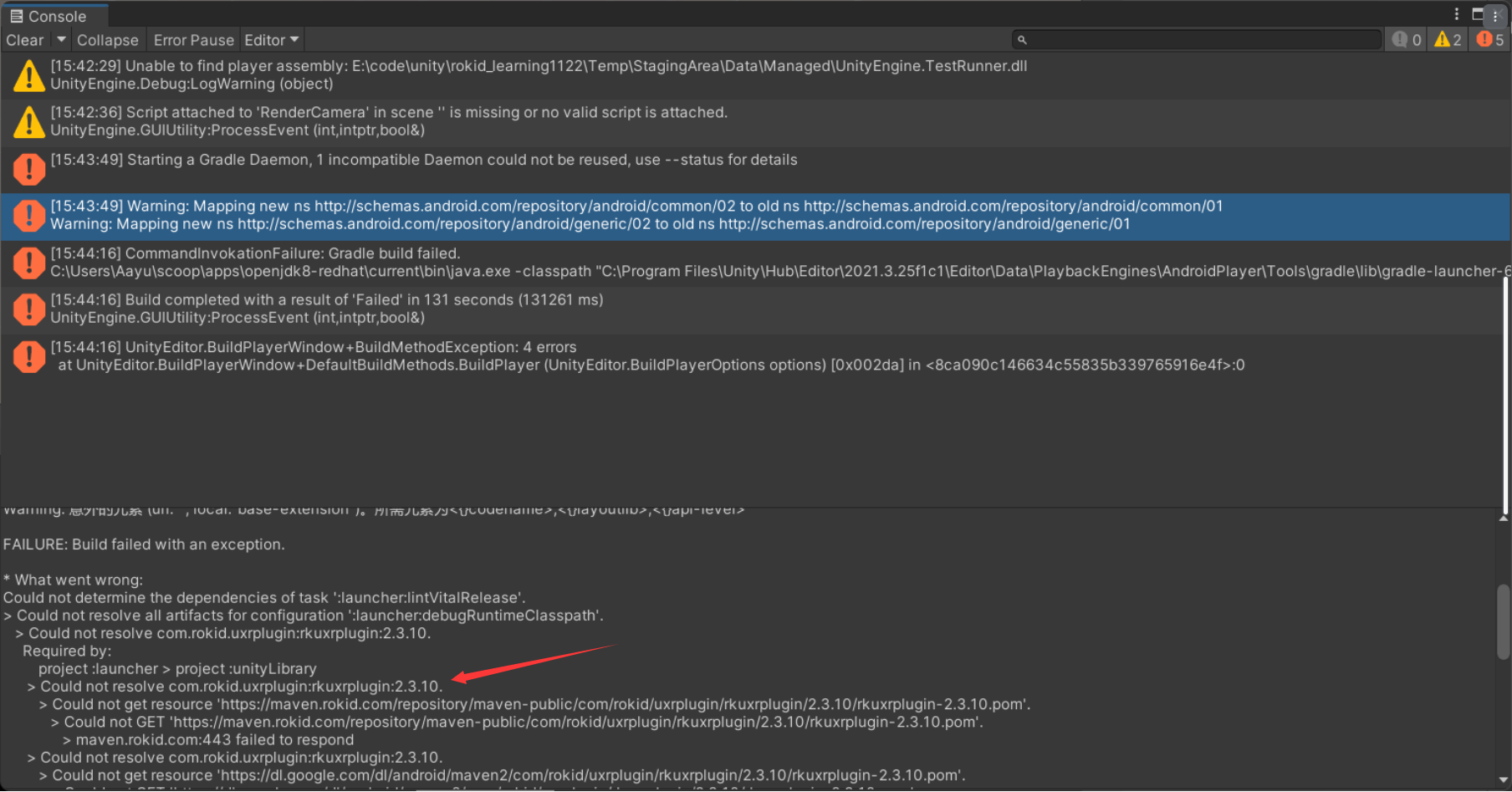 从报错信息中可以看到一条关键信息 Could not resolve com.rokid.uxrplugin:rkuxrplugin:2.3.10