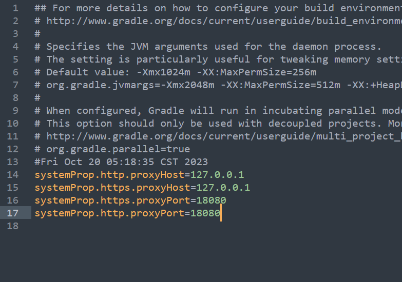 至于第二个原因,就是我误打误撞找到了解决办法哈哈,原先我曾经用 Android Studio 开发过 Android 项目,之前开发时为了解决网络环境,就配置了代理,代理设置就被配置在了全局的 gradle.properties 文件中