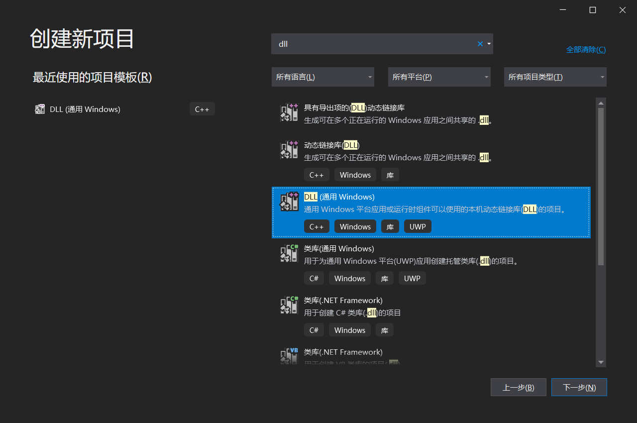 选择创建新项目,搜索 DLL 模板,选择 DLL(通用Windows) 模板,点击下一步