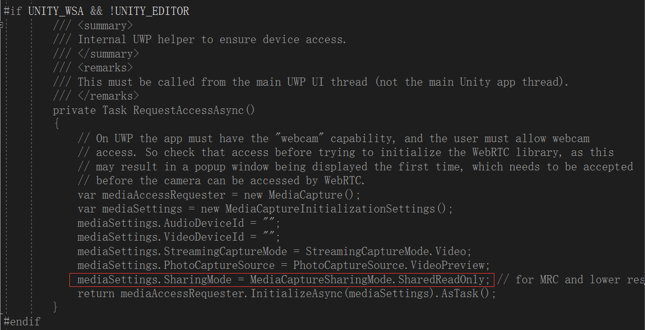 这下事情就很清楚了,MixedReality-WebRTC 库是以 SharedReadOnly 共享相机模式进行运行的,而 Unity 封装好的 Windows API 实现的图像捕获功能可能是以 ExclusiveControl 独占模式来捕获图像的,所以就造成了冲突。