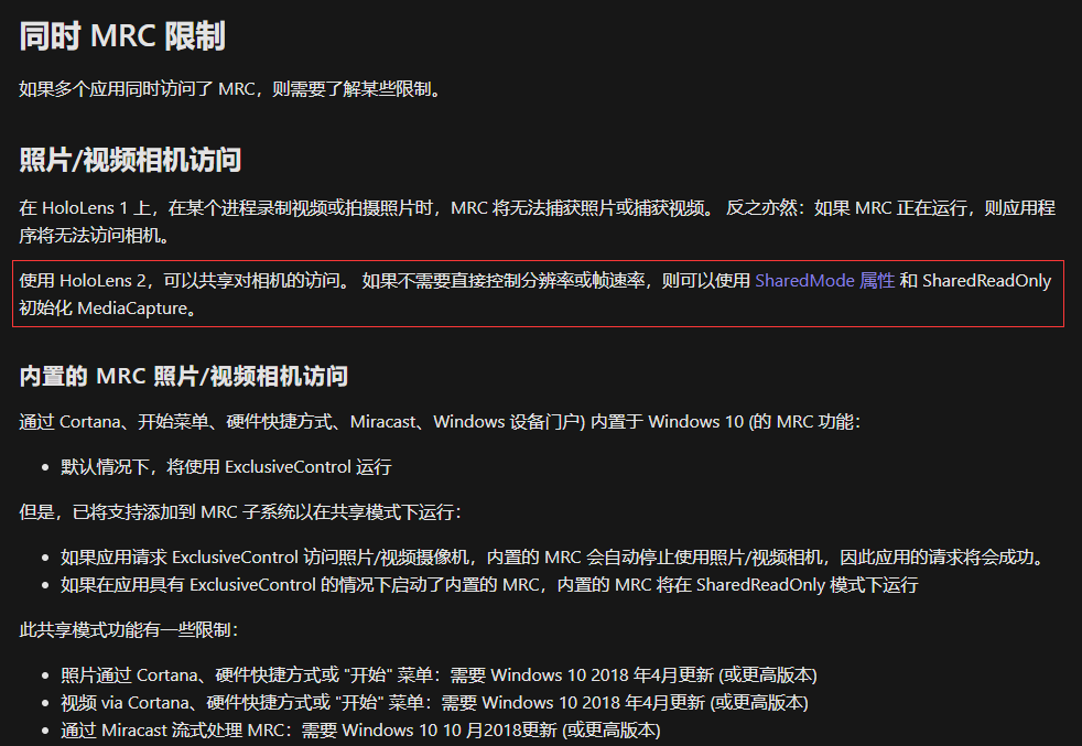 然后,我又在 面向开发人员的 Mixed Reality 捕获 这篇文章中,发现 HoloLens2 是可以共享对相机的访问的(我之前开发过 HoloLens1 代,就遇到过对相机资源的抢占这种情况,对这个问题印象就比较深刻),如下图