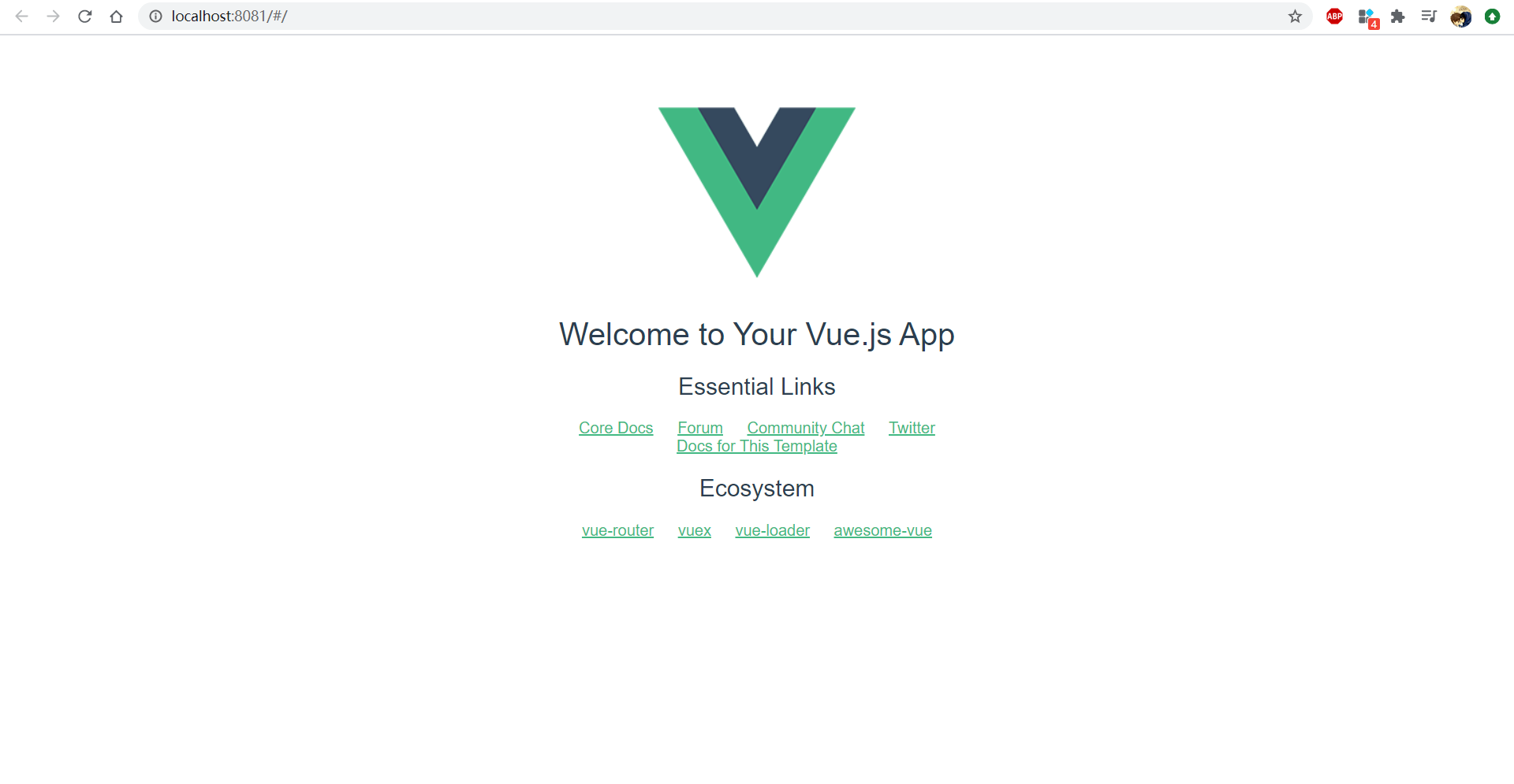 项目默认运行在 localhost:8080 地址上,若端口被占用,则会自动运行在 8081 端口上。输入网址即可看见 Vue 网页,说明 Vue 环境配好了