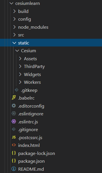 进入 node_modules\cesium\Build 文件夹中,将编译好的 Cesium 文件夹复制到根目录下的 static 中,并把其中 Cesium.js 删除,如下图所示
