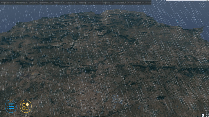作为一个三维地球,在场景中来点雨雪效果,貌似可以增加一点真实感。Cesium 官网 Demo 中有天气系统的实例,用的是 Cesium 中的粒子系统做的。效果如下图所示,粒子系统的本质是向场景中添加了很多物体,用 BillBoard 技术展现。这种实现方式有一个麻烦的地方就是当视角变化 (拉近、拉远、平移、旋转) 时,粒子就会变化,甚至会消失,很影响体验。考虑用 shader 的方式直接模拟雨雪效果,恰好发现了 Catzpaw 大神写的模拟雨雪的 shader,果断增添到 Cesium 中。