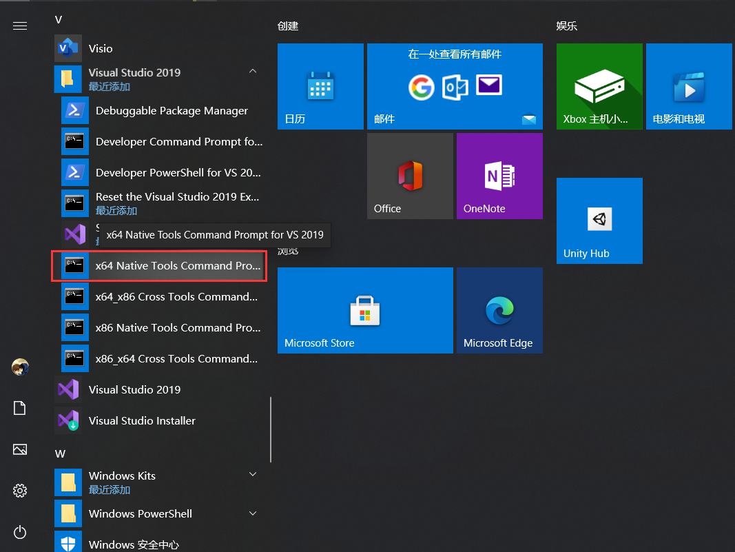以管理员身份运行适用于 VS 2017 的 x64 本机工具命令提示该程序(英文版本为 x64 Native Tools Command Prompt for VS 2017),如下图