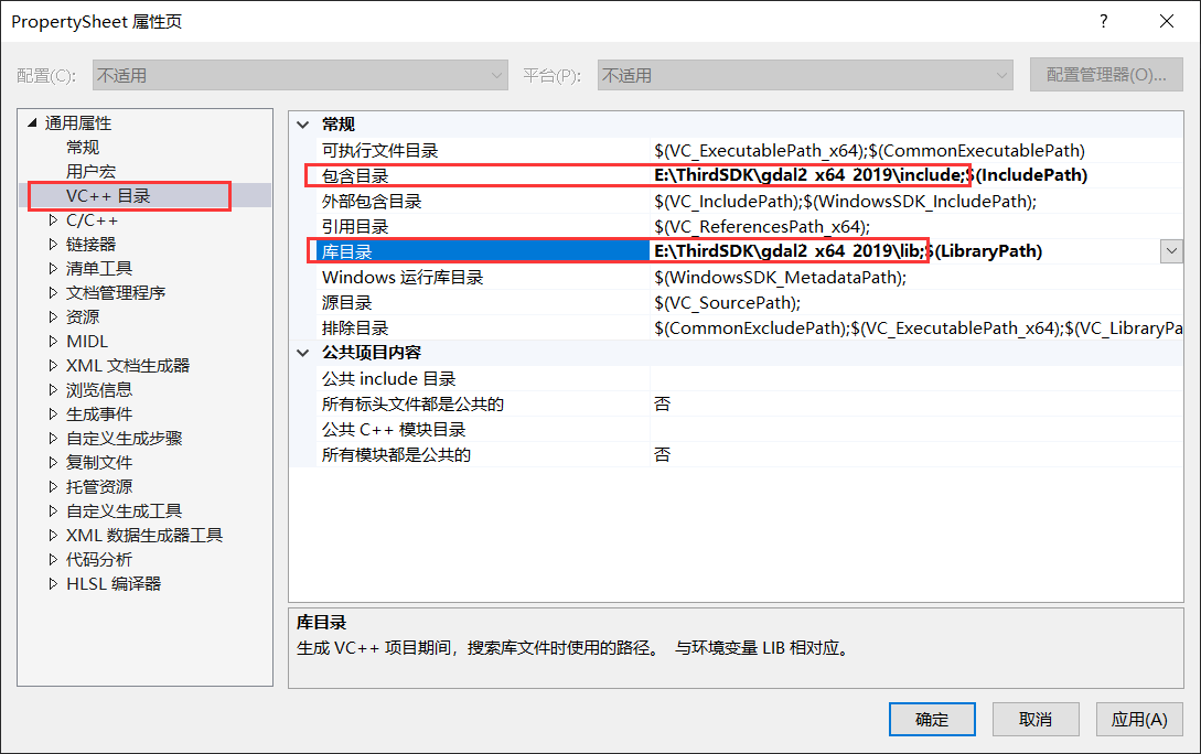然后双击新添加的项目属性表,在 包含目录 和 库目录 中添加编译好的 gdal 路径,如下图