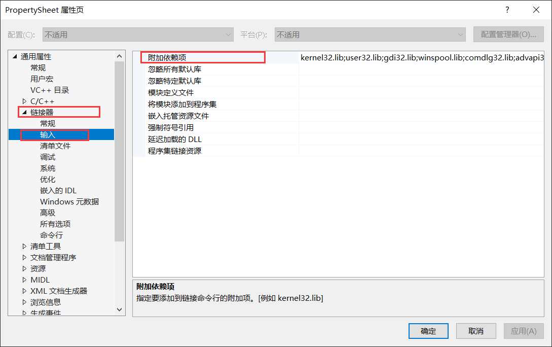 点击应用。然后在 链接器->输入->附加依赖项 中点击编辑,手动输入 gdal_i.lib ,如下图