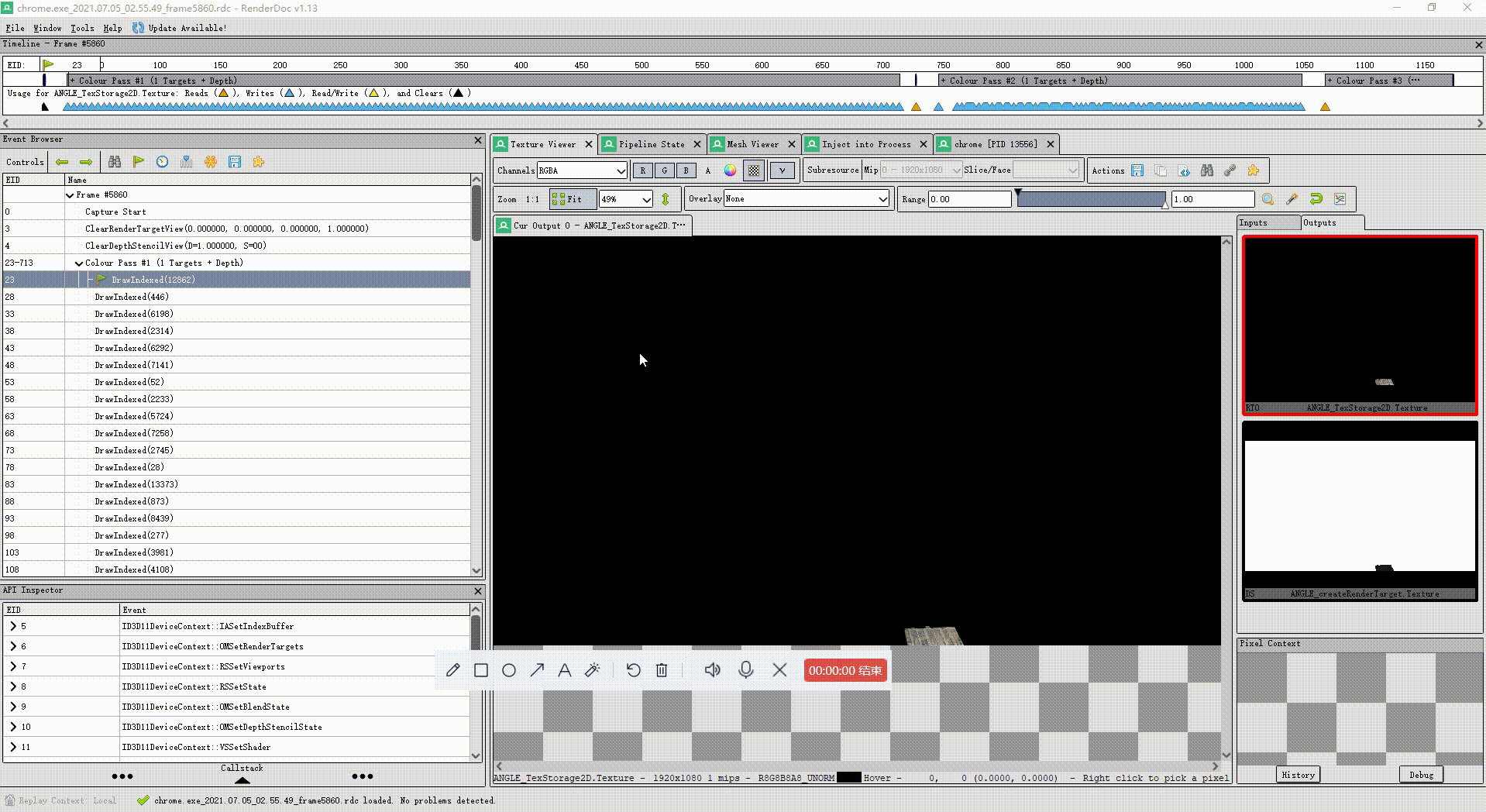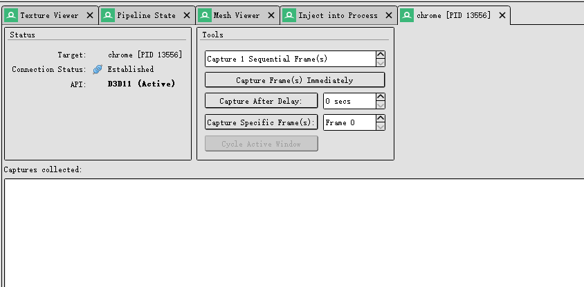 这时,我们点击 Chrome 小弹窗上的确认按钮,可以看到 RenderDoc 面板上的 API 状态变成了 D3D11 ,右边的按钮也由灰色变成可点击的状态,如下图