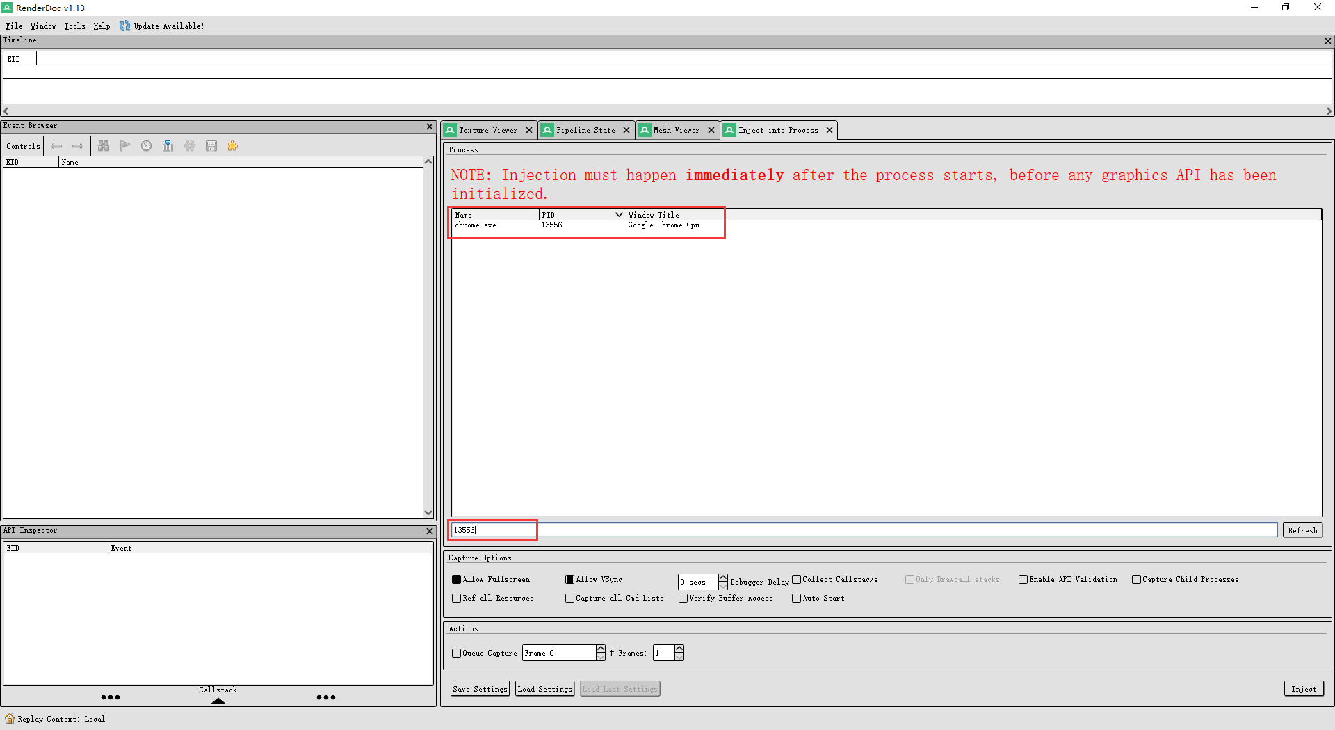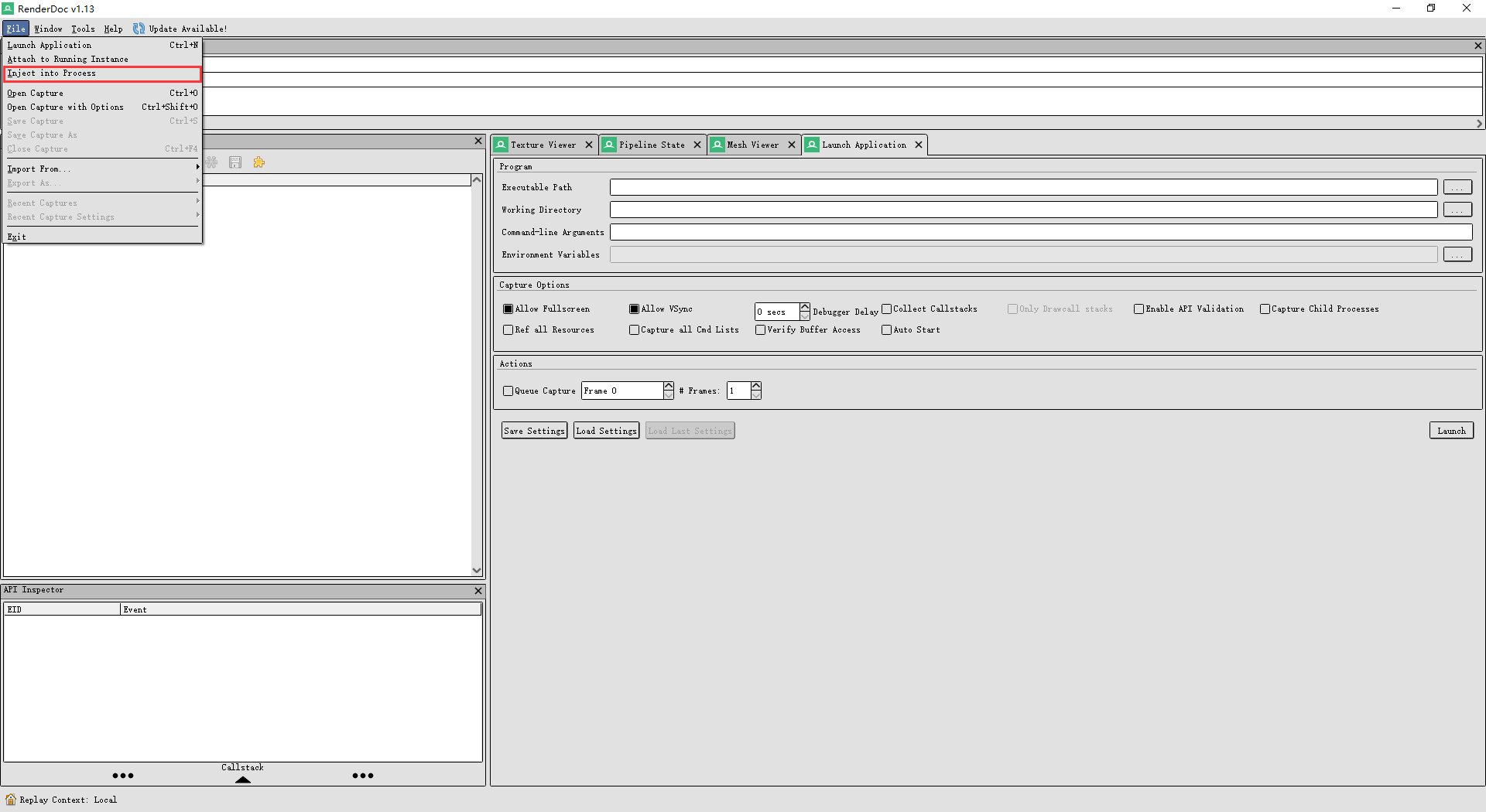 打开刚刚安装好的 RenderDoc 软件。然后在菜单栏 File 里点击 Inject into Process 选项,如下图