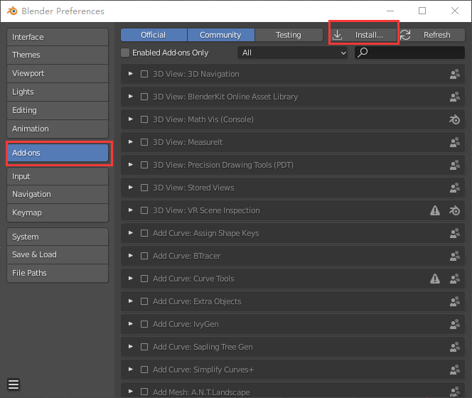 点击菜单栏 Edit ,点击 Preferences ,在打开的界面上选择 Add-ons ,然后点击 Install ,如下图