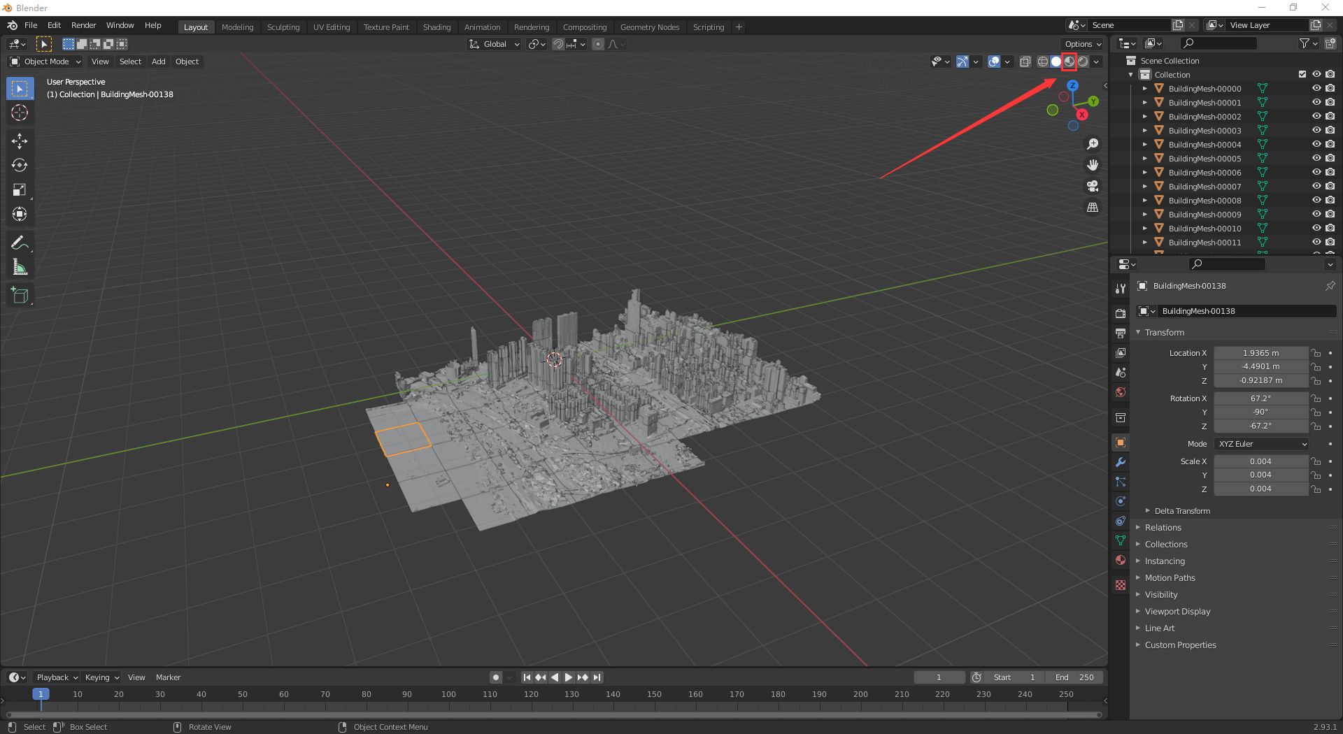 点击菜单栏的 File ,点击 Import ,最下面就出现了 Google Map Capture 选项了,点击,选择刚刚保存的 .rdc 文件,稍等片刻,模型便被显示在 Blender 里啦。默认没有显示材质贴图,我们可以点击界面右上角的这个按钮,打开贴图渲染,如下图