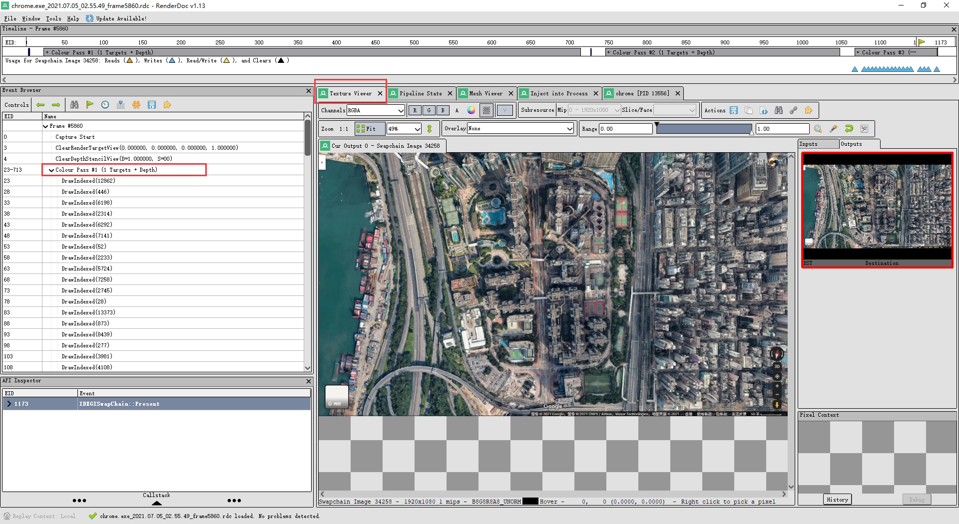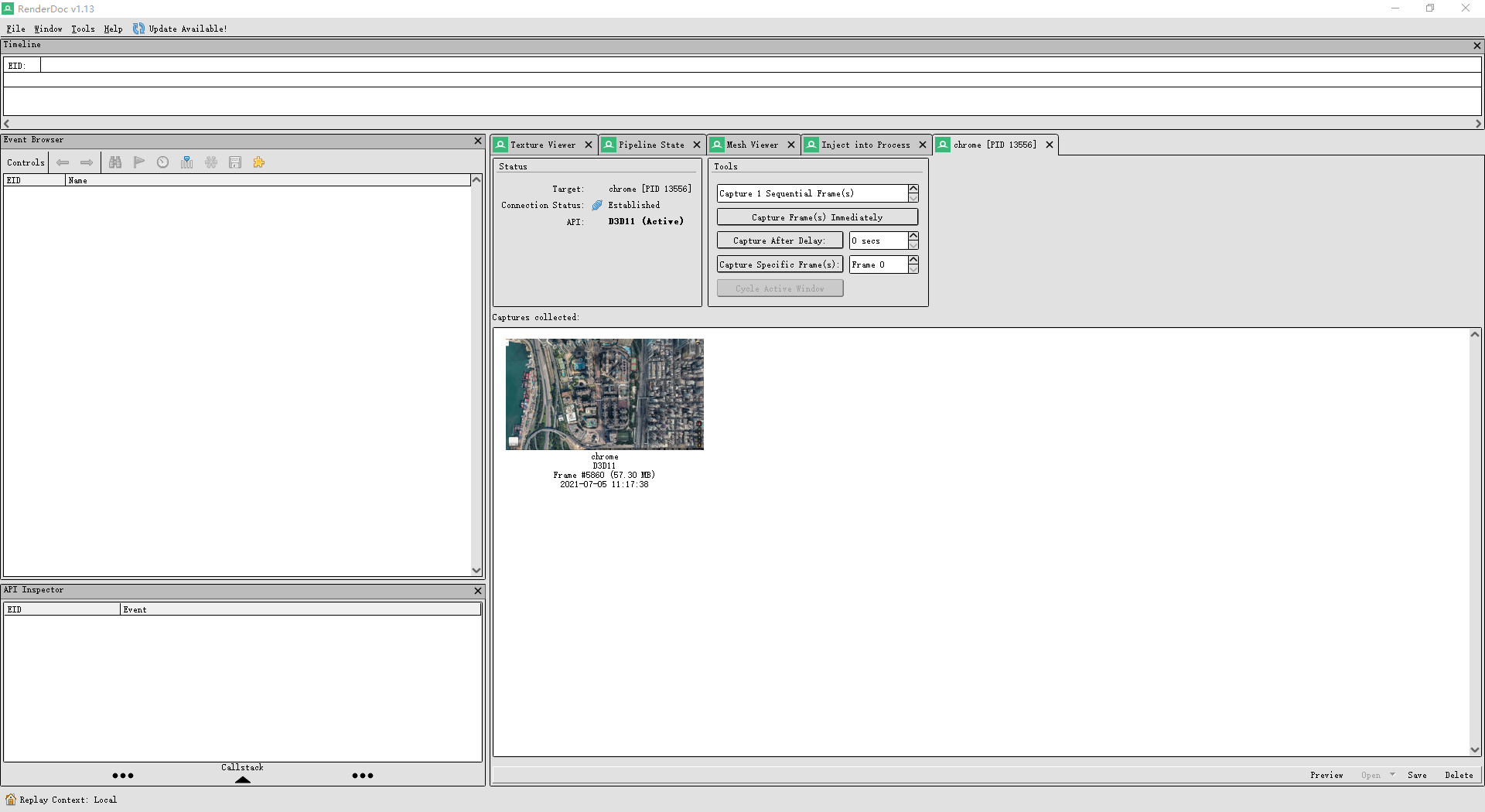 完成以上步骤后,跳转到 RenderDoc 软件,点击 Capture Frame(s) Immediately 按钮,然后再跳转到 Chrome 界面,微微拖动下地图,可以发现当前界面的 3D 城市模型已经被捕获到 RenderDoc 里啦,如下图