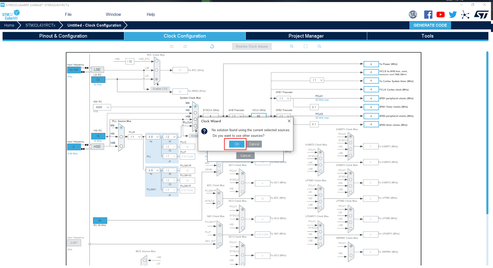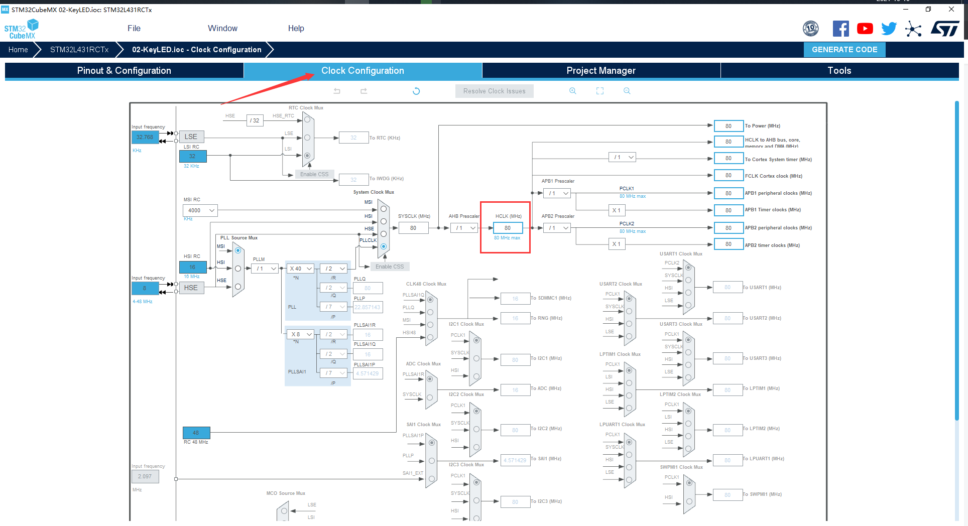 配置时钟树。STM32L4 的最高主频可达到 80M,使 HCLK = 80Mhz ,如下图