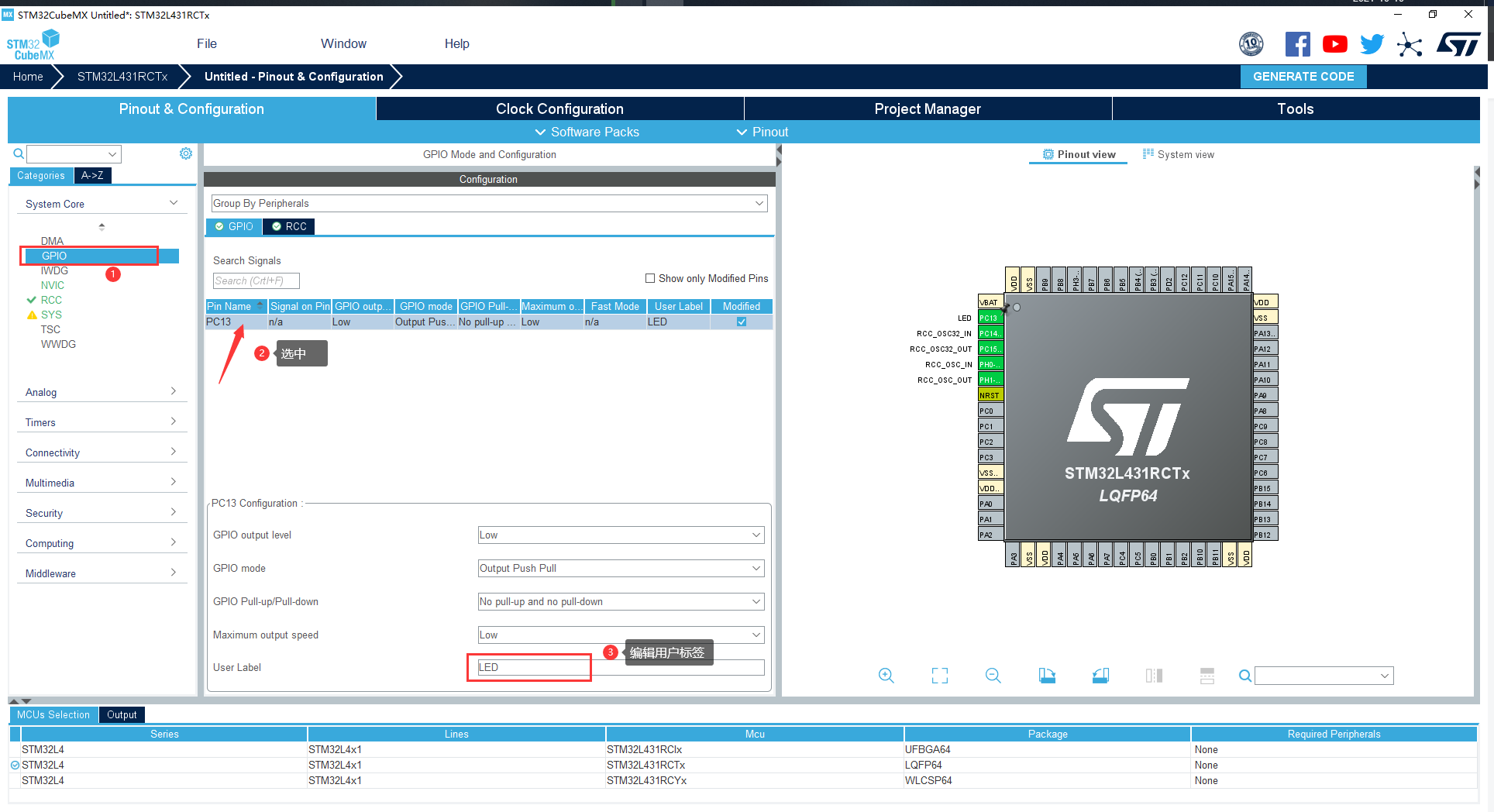 在输入框中输入 stm32l431rc ,选中,然后双击选择中间 LQFP64 的这款,如下图