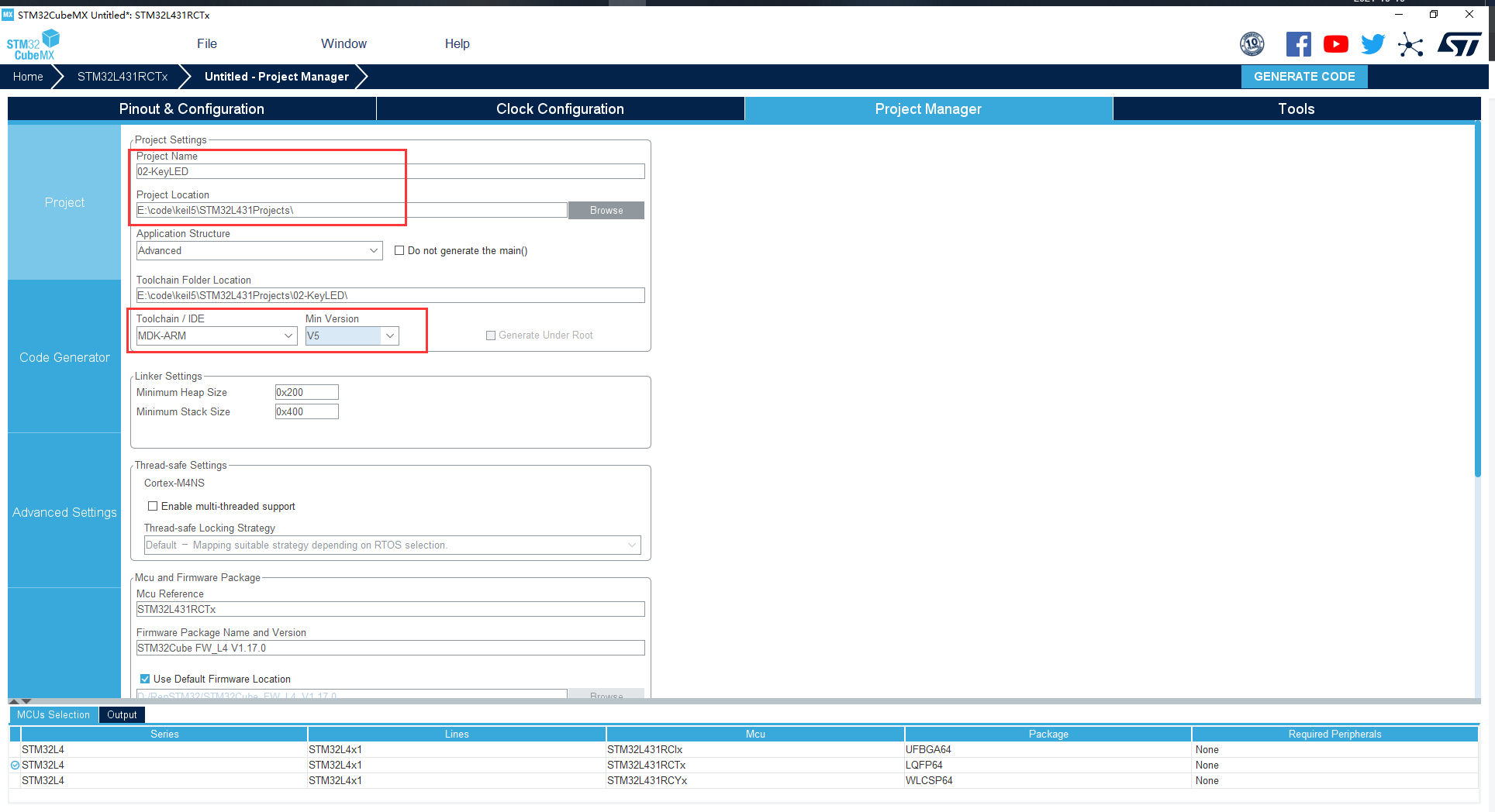 最后选择右上角的 GENERATE CODE ,即可完成工程的创建