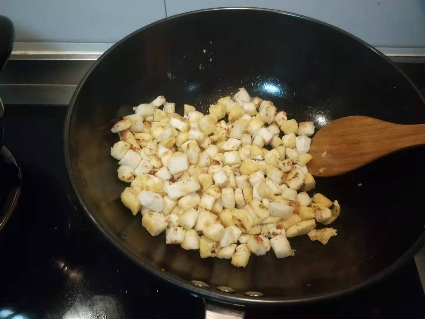 今日晚饭:炒馍花 + 米汤~# 食材(ingredients)馒头,鸡蛋,葱(可选),辣椒(可选)white bread, eggs, scallion, chili# 调料(seasoning)油,盐,花椒粉oil, salt, szechuan pepper# 做法馍切成块,将鸡蛋打入馍中,搅拌均匀热锅,放油,把馍倒入锅中,翻炒倒入葱,辣椒(可选)放盐,花椒出锅~ 美食