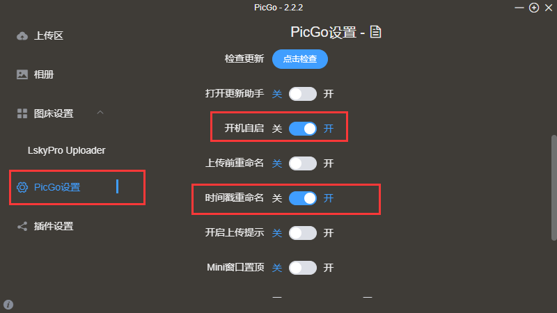 修改快捷键可以在 PicGo 的设置中设置,同时我还会开启 开机自启 和 时间戳重命名 这两个设置,时间戳重命名可以直接将刚刚用 QQ 截取的乱七八糟文件名改成当前的时间,看起来就舒服很多啦,设置如下图