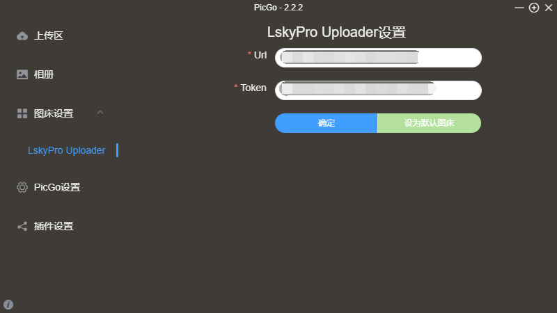接下来就可以在 PciGo 里面配置 lskypro 插件了,如下图,将刚刚找到的图片上传 URL 和 Token 设置进去