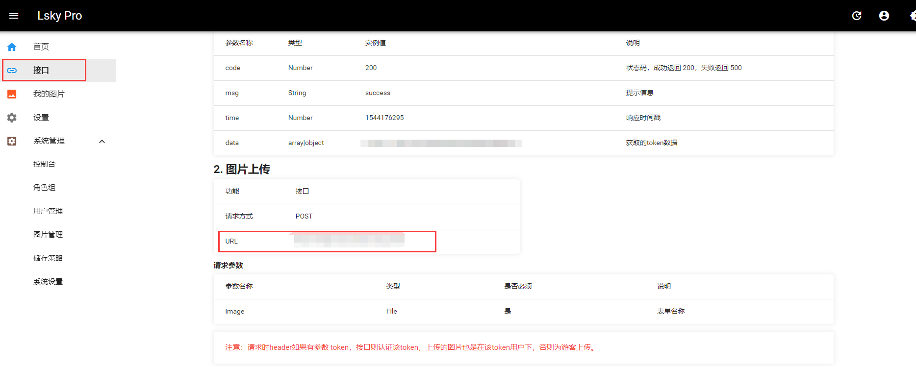 然后可以在左侧菜单栏中找到 接口 设置,可以在里面详细查看接口的相关说明,主要需要关注的是图片上传的 URL 参数,如下图所示