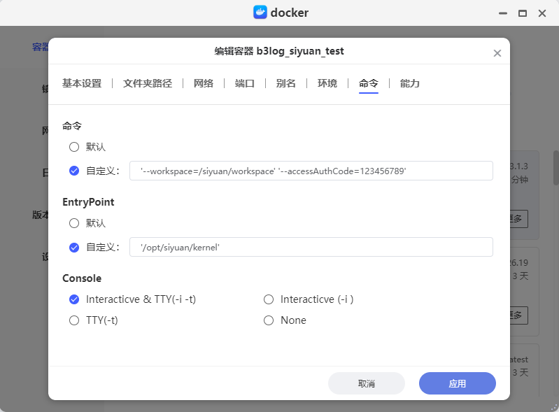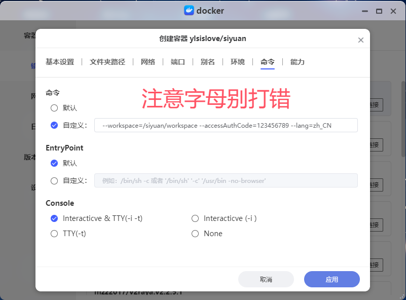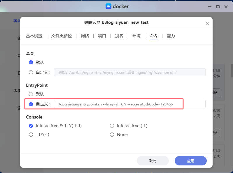 用最新的官方 v3.1.10 版本试了下,发现在命令自定义里设置 「 '--lang=zh_CN' '--accessAuthCode=123456789' 」和在 EntryPoint 自定义里 '/opt/siyuan/entrypoint.sh' 命令后面跟上「 '--lang=zh_CN' '--accessAuthCode=123456789' 」两种写法都可以,容器都能正确创建并启动~