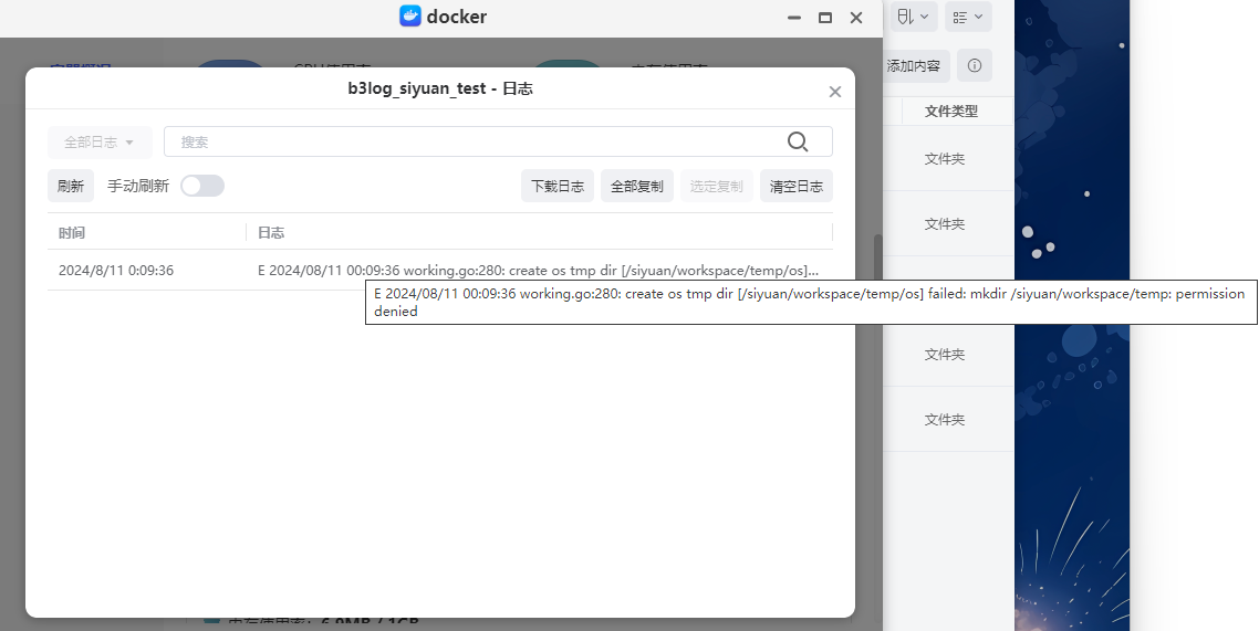 报错原因是因为:官方的思源笔记 Docker 镜像是使用的默认创建的普通用户 siyuan (uid 1000/gid 1000)来启动内核进程的,但极空间文件夹是 root 用户权限,当创建 docker 镜像时做了文件夹映射后,普通用户 siyuan 是没有权限在设置的目录下创建新的文件夹