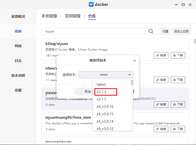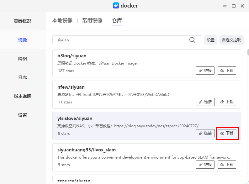 部署就很简单了,首先在极空间 Docker 镜像界面搜索 siyuan,然后找到 ylsislove/siyuan 版本的,点击下载。
