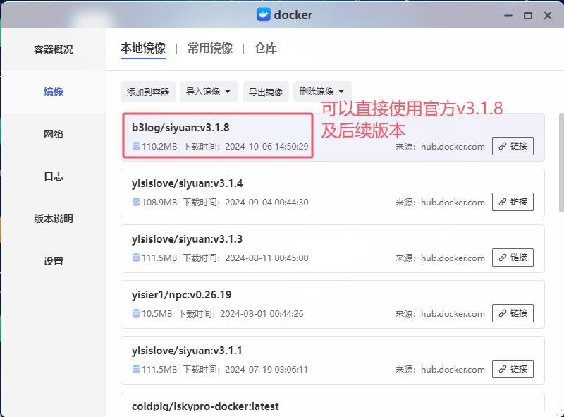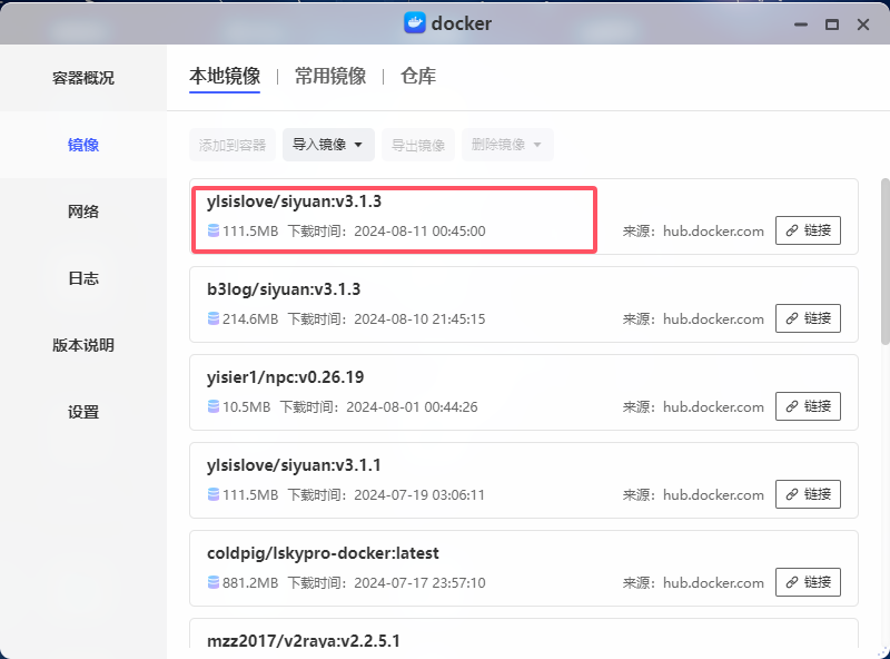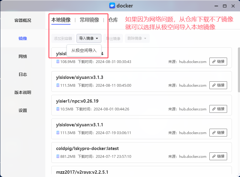 这里可能会有用户碰到点击下载后显示不出版本信息,或镜像无法拉取的问题。这是因为国内有些地区的网络无法访问 Docker Hub,所以拉取不到镜像。有这个问题的用户可以在博客给我留言,我抽空就把最新镜像导出成文件,上传到极空间后,就可以在本地镜像下用上传文件的方式导入镜像了。