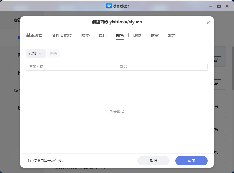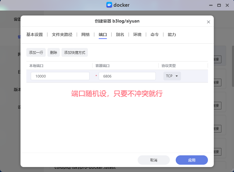 6806是思源笔记访问端口,6807可以在思源笔记里配置成服务发布端口。所以这两个端口都需要映射出去,我选择映射成26806和26807这两个空闲端口,小伙伴也可以自己映射成其他端口,都是 no problem - 别名:保持默认即可