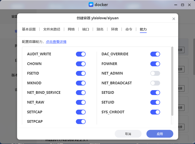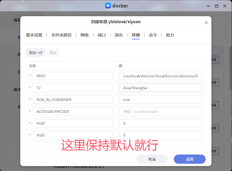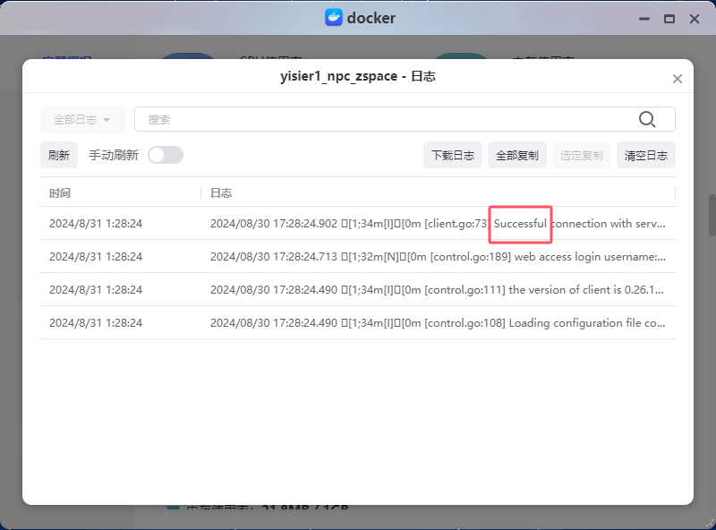 后面 别名 、 环境 、 命令 、 能力 等都保持默认即可,最后点击应用,容器创建成功后,点击容器的日志按钮,出现如下日志,说明 NPC 容器配置成功~