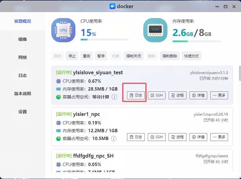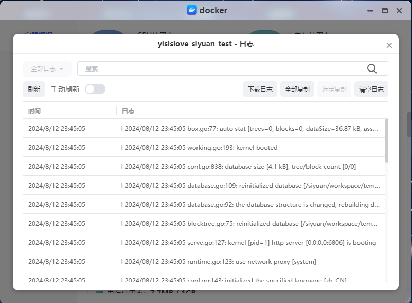 最后点击应用,不出意外的话容器就会创建成功啦,创建成功后,记得点击容器的日志按钮,出现如下日志,说明容器配置的没问题。