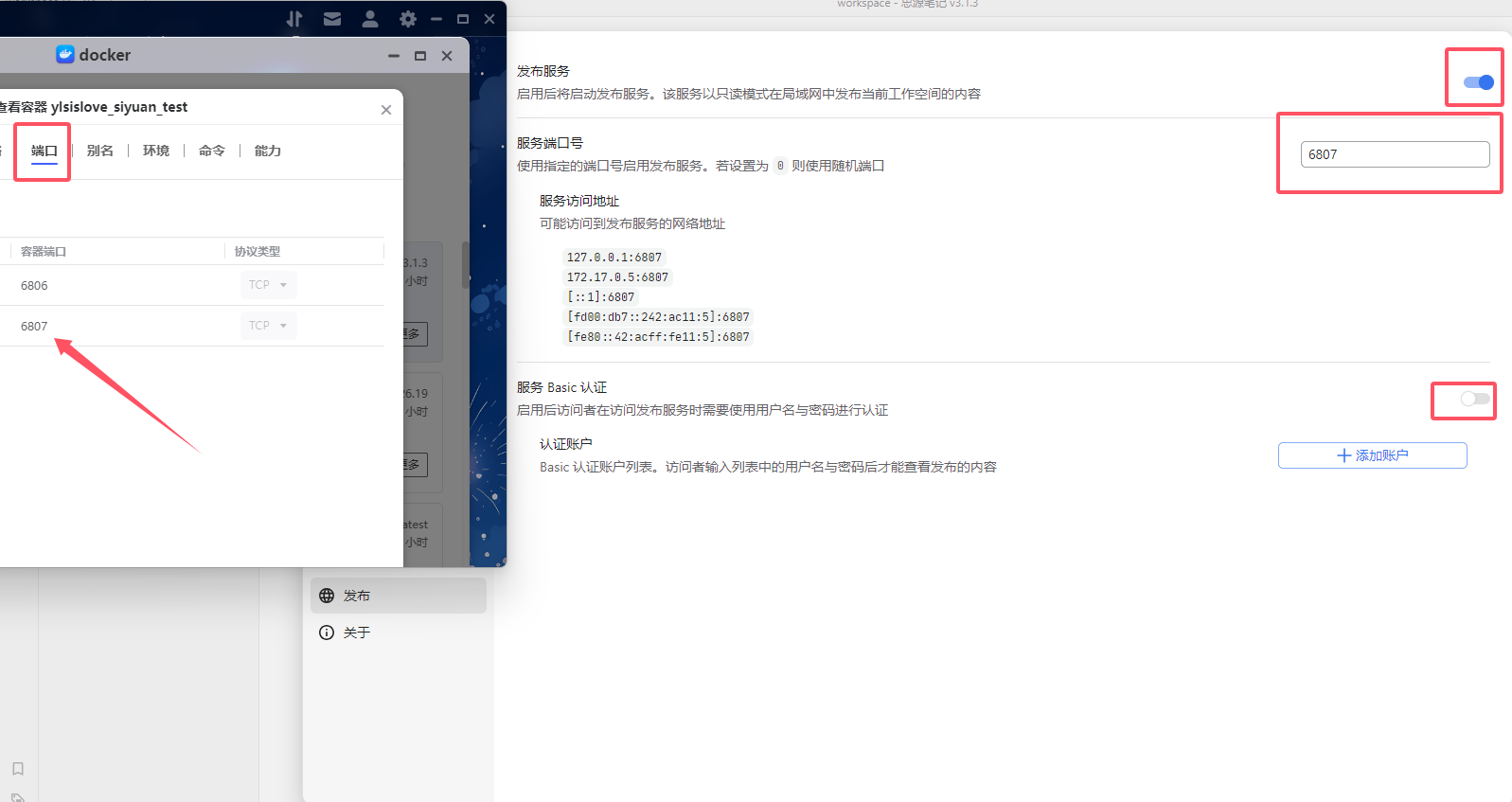 注意端口要和容器中设置的端口对应,同时,不想设置密码的话,设置界面的「 服务 Basic 认证 」也要关闭。