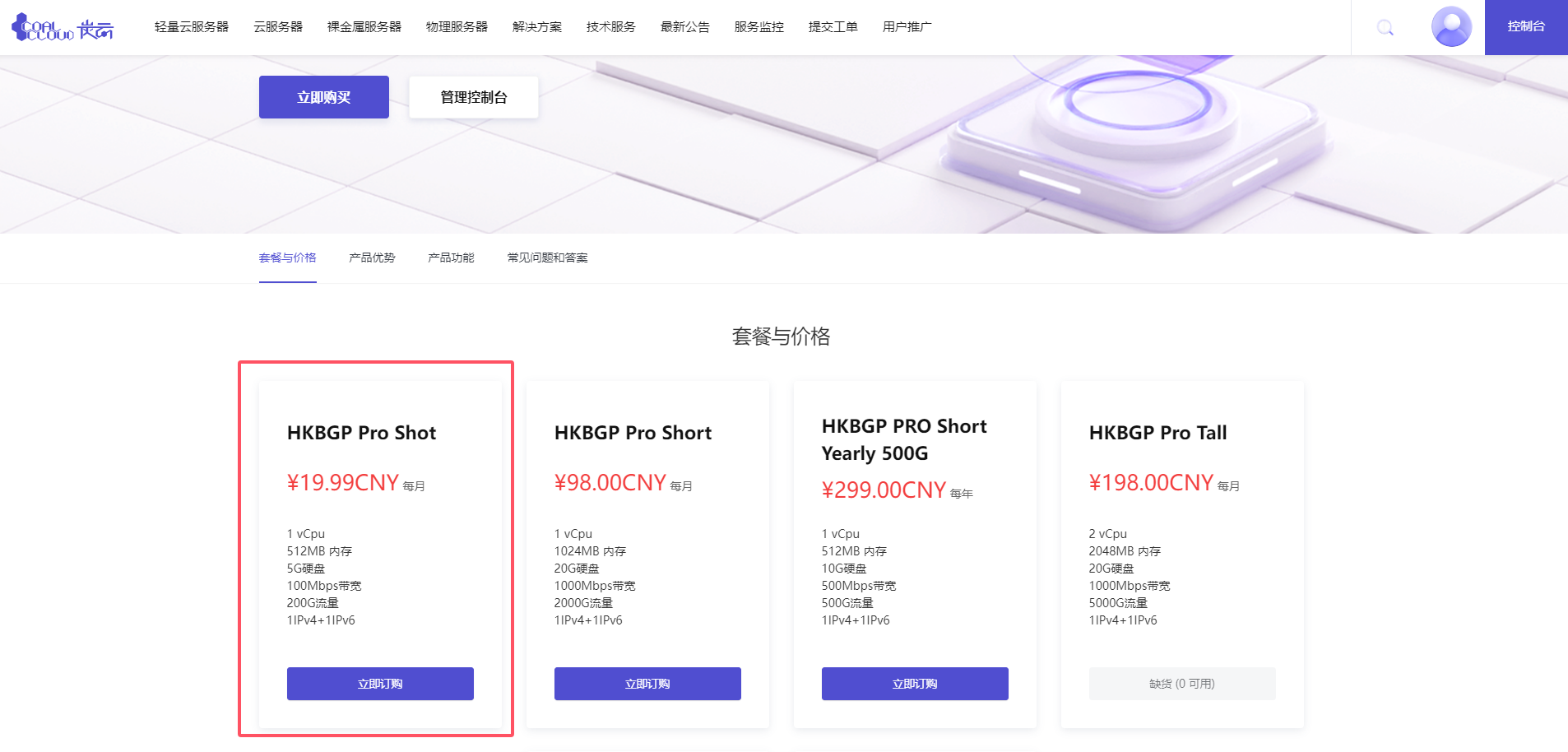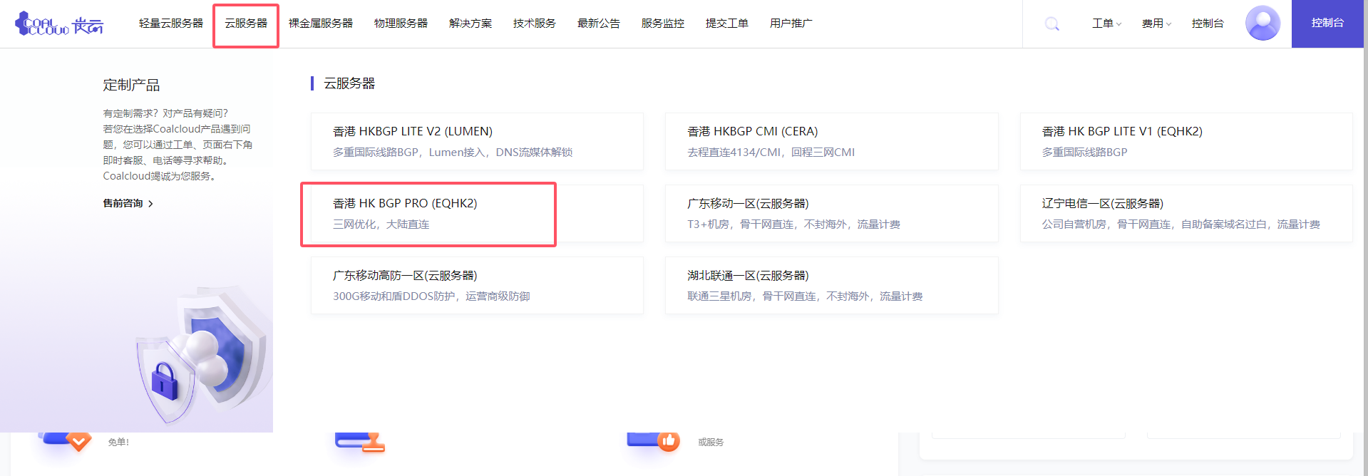 可以在右上角先注册一个账号,注册完成后,选择云服务器栏目下的「 香港 HK BGP PRO(EQHK2)」服务器,选择香港地区有挺多好处的,比如网络访问不受限,可以直接拉取 Docker 镜像或 GitHub 仓库,域名不用备案等等~