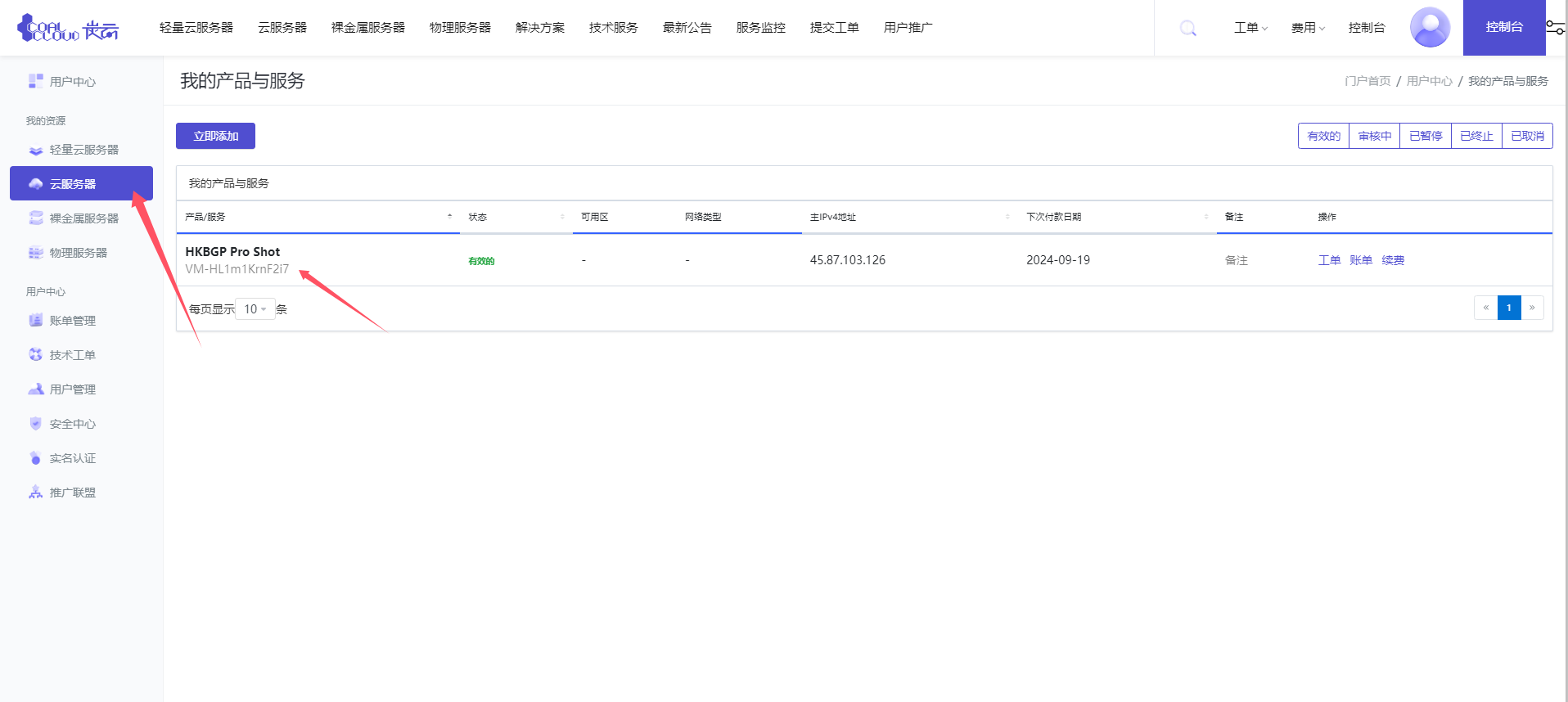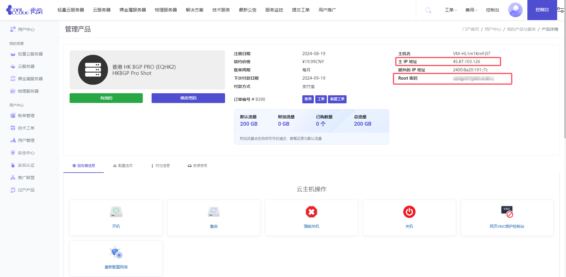购买完成后,可以在左侧的云服务器栏目中,看到我们购买后的云服务器,点进去后就能看到更详细的信息~