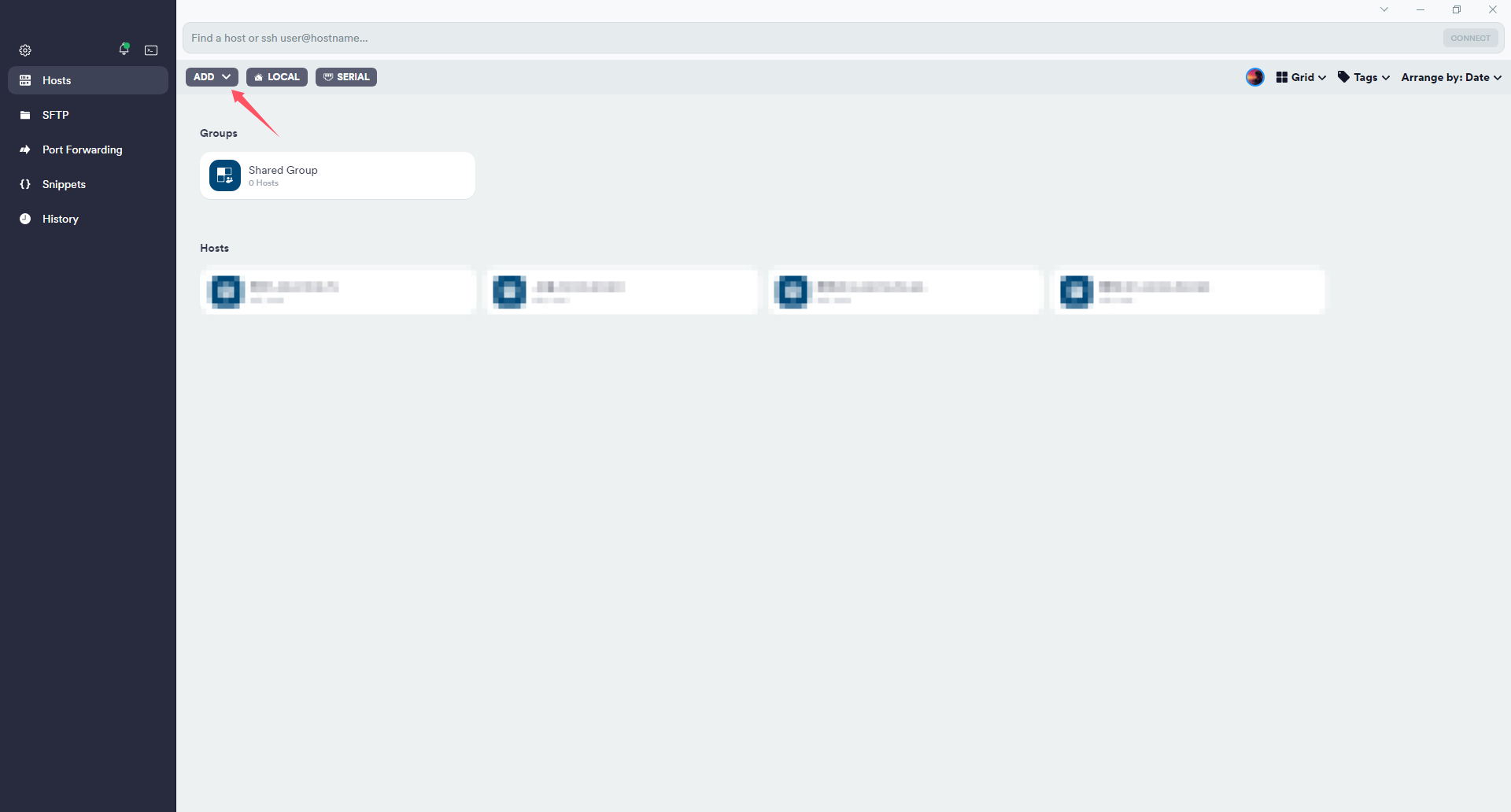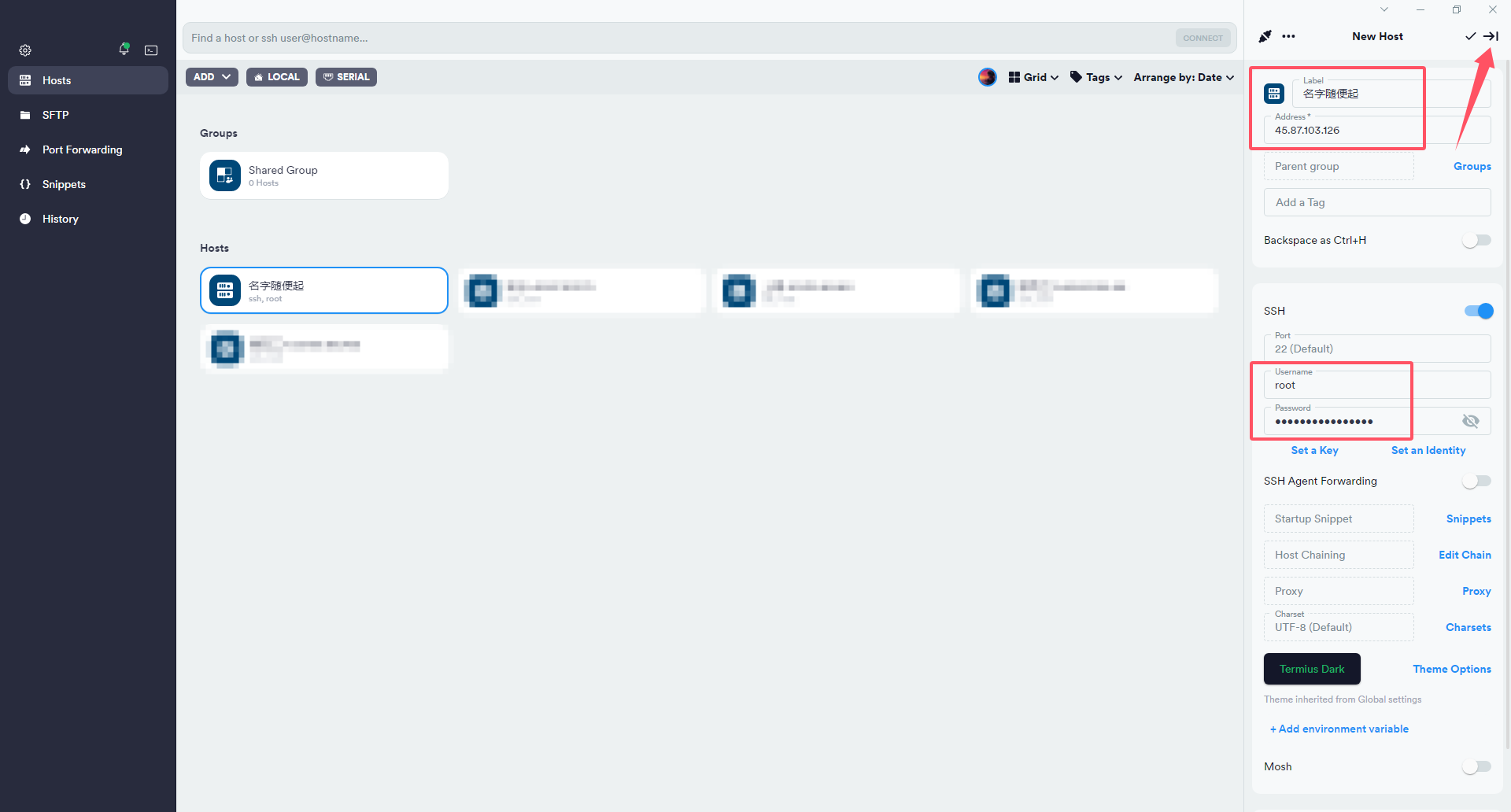 首先在服务器详情界面确认我们的 IP 地址和 Root 密码,然后在 Termius 里点击 Add,选择 New Host,然后输入我们的 IP 地址,用户名输入 root,密码输入我们的 Root 密码,配置完成后,点击右上角退出编辑界面~