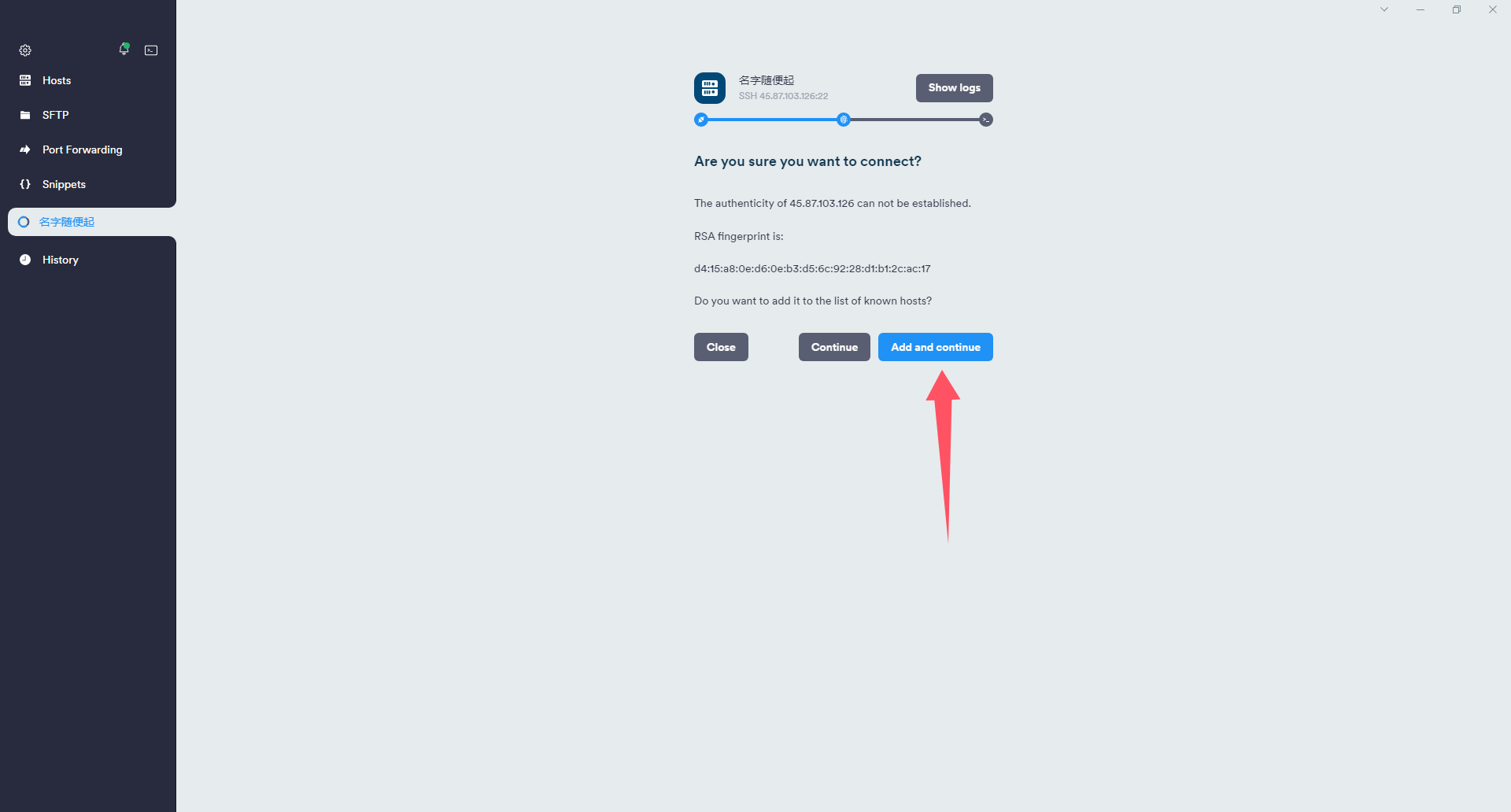 在主页面双击我们刚刚配置的服务器,然后选择 Add and continue ,就能成功连接到我们的云服务器啦~