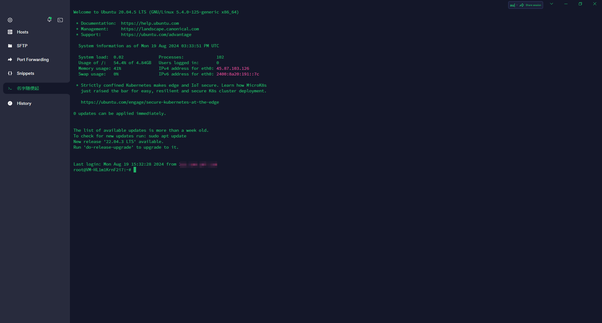 注意,因为博客有防盗机制,所以直接复制的话会带一串文本,所以记得在粘贴到 Termius 前,把多余的文本内容删除掉,只保留命令内容~